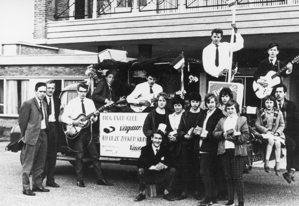 Foto zwart/wit.Muziekband "THE SWALLOWS", bij een inzamelingsactie voor een goed doel.