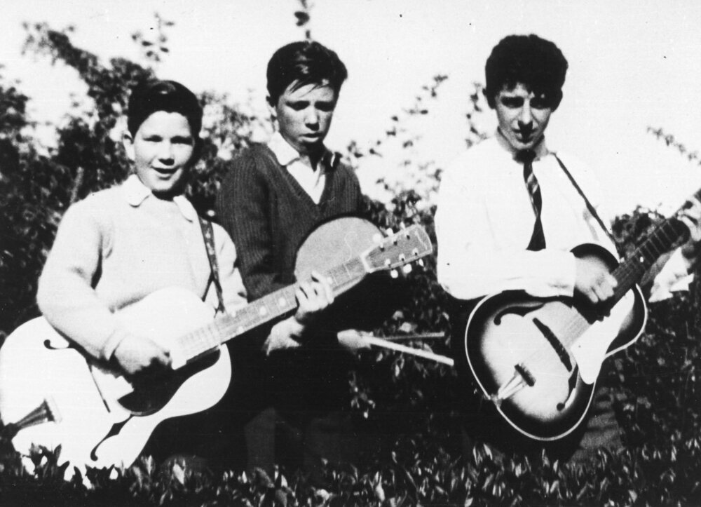 Foto zwart/wit.Het begin van Muziekband "THE SWALLOWS". v.l.n.r. Rudy v d Hoek, Kees Kweekel, Leo Meijburg.