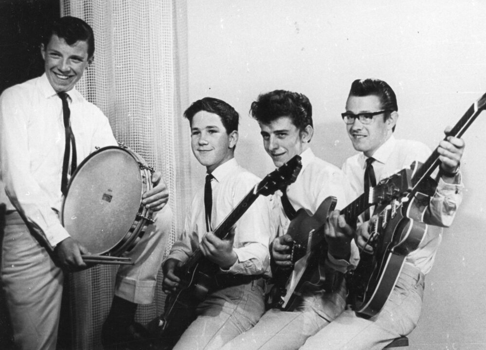 Foto zwart/wit.Muziekband "THE SWALLOWS". V.l.n.r. Kees Kwwekel, Rudie v d Hoek, Leo Meijburg, Jan v Velden.