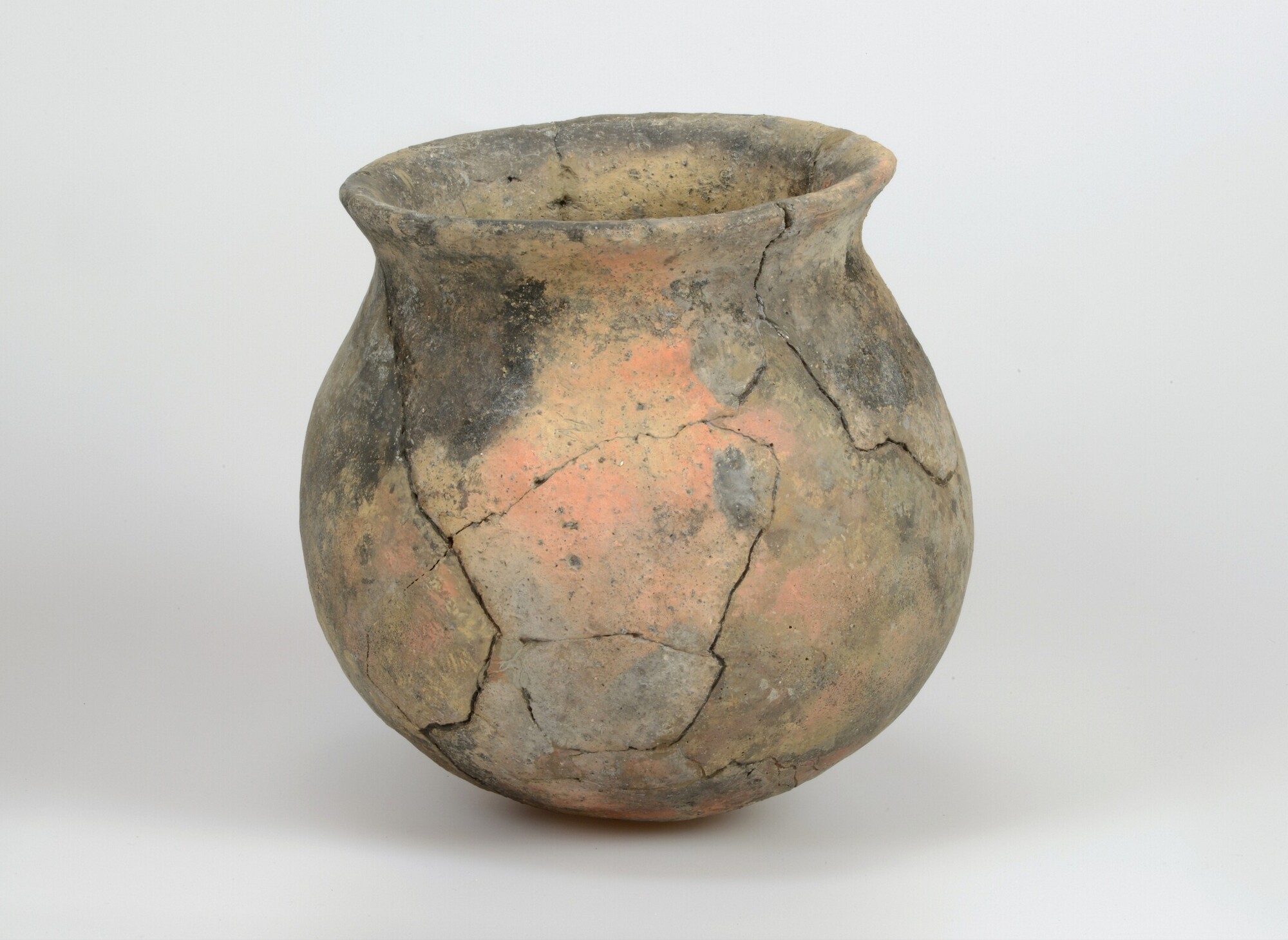 Kogelpot; kp-kog-4; kogelpot met hoge, aan de bovenzijde afgevlakte rand; kogelpotaardewerk met steengruismagering; herkomst: West- of Noord-Nederland