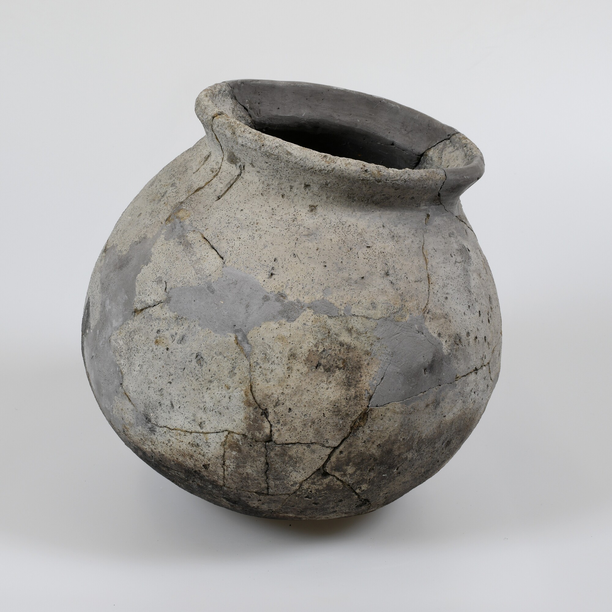 Kogelpot; kg-kog-; bolvormige pot met naar buiten staande, afgeschuinde rand; zandmagering; grijs baksel; roetsporen aan de onderzijde