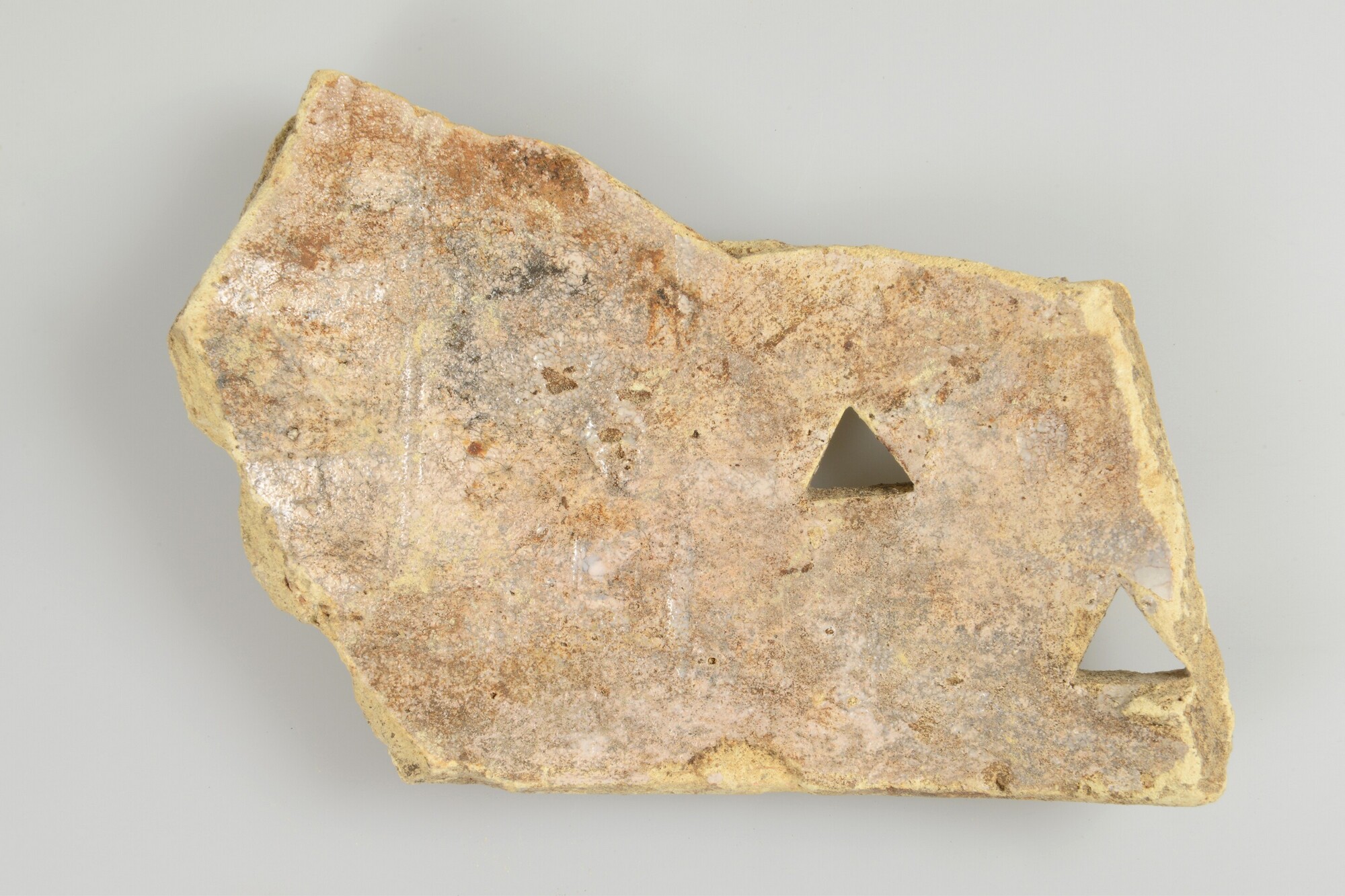 Kokerfragment; productieafval plateelbakkerij; twee driehoekige gaten in wand; inwendig tinglazuur