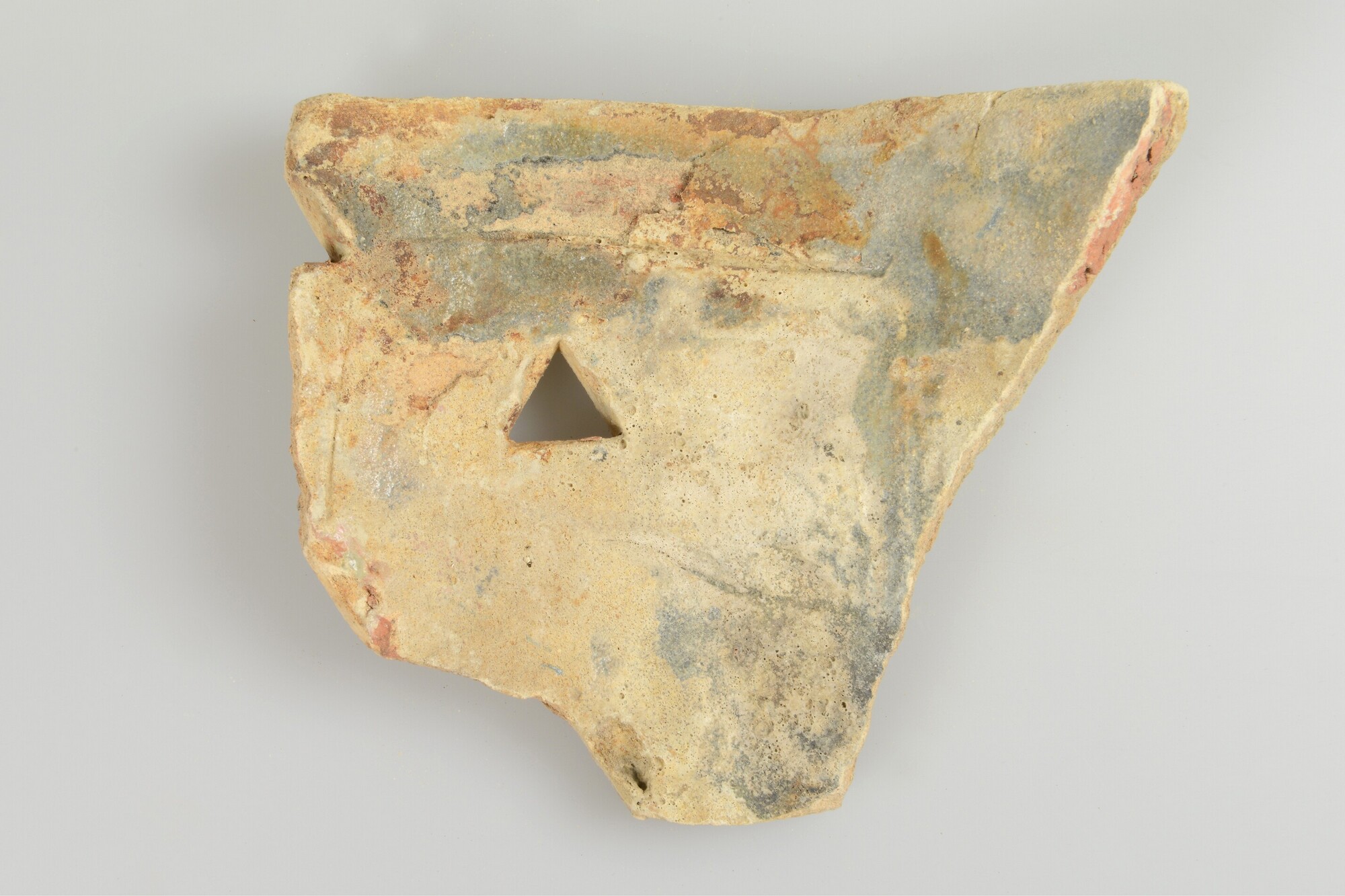 Kokerfragment; productieafval plateelbakkerij; driehoekig gat in wand; inwendig tinglazuur