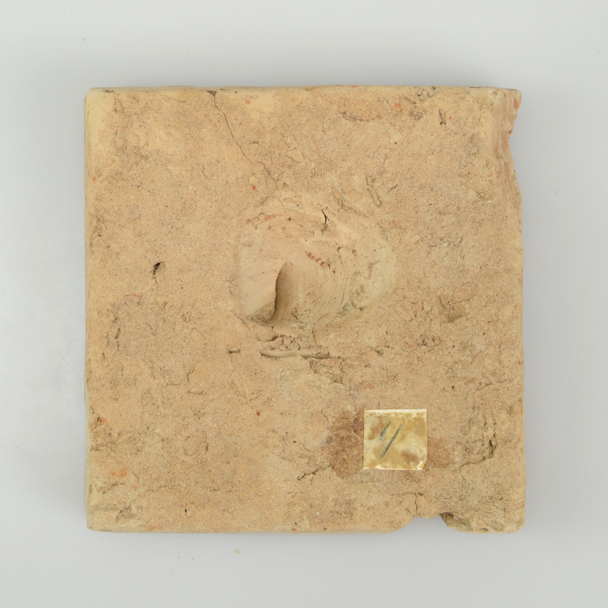 Plavuis; roodbakkend aardewerk; ongeglazuurd; uitholling aan onderzijde; herkomst: Nederlanden