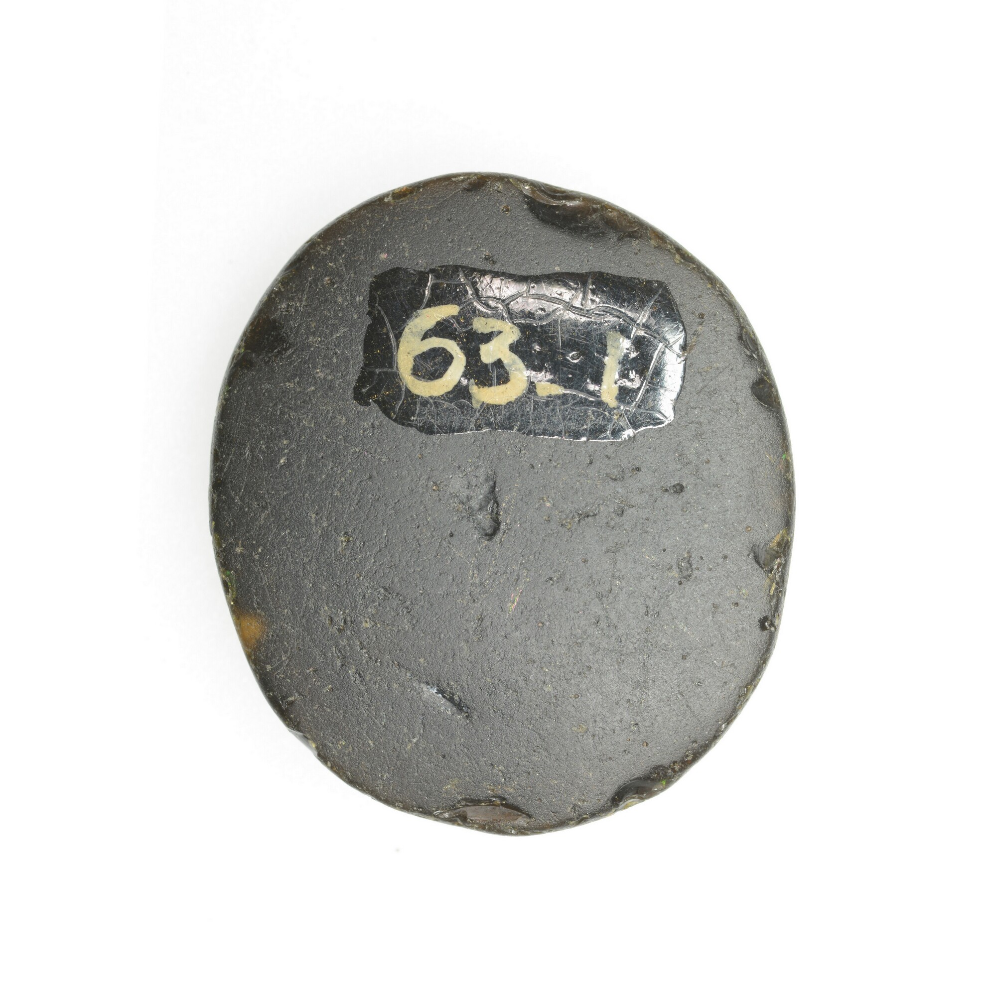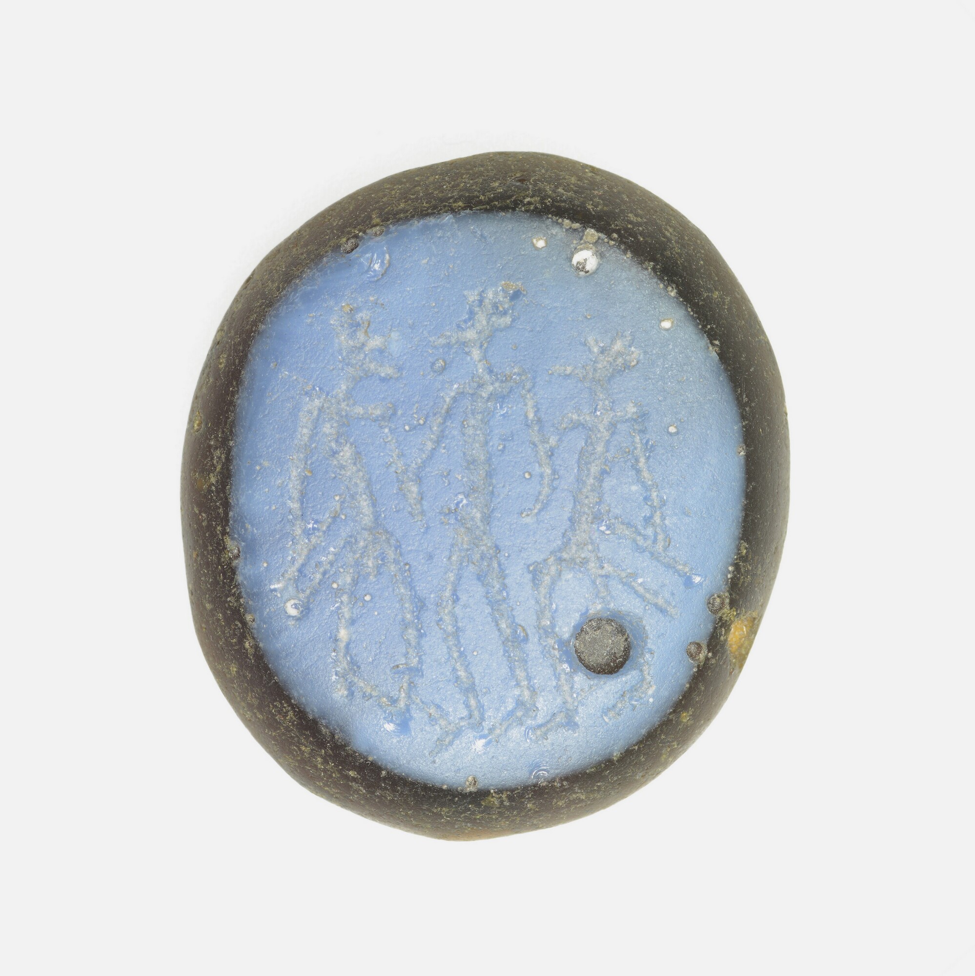 Alsengemme; ovaal; opgebouwd uit twee op elkaar gekitte lagen gegoten glas; de onderste langs de rand afgeschuinde, van onderen licht convexe laag is donker zwart met doorschijnend licht geel-bruin; de bovenste laag is licht violet-blauw. De intaglio in de bovenste laag bestaat uit drie langerekte baardige figuren, die elkaar bij de hand of de arm ...
