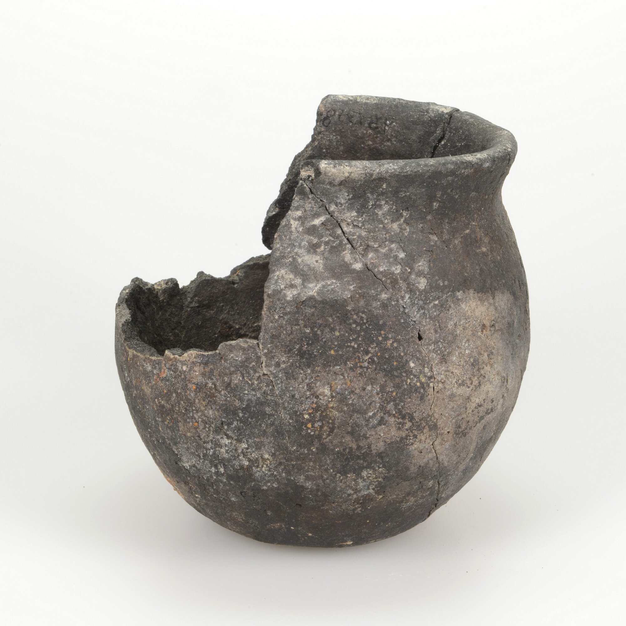 Kogelpot; eivormige kogelpot een naar buitenstaande rand, op standvlak; fijne steengruis magering; in- en uitwendig beroet