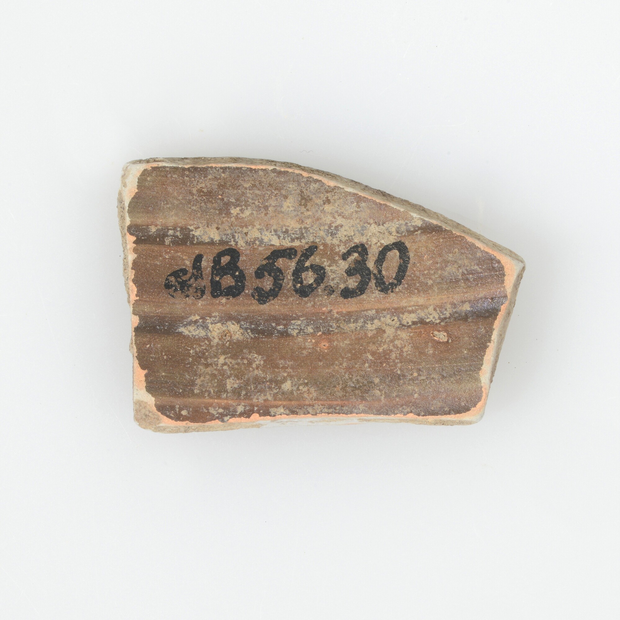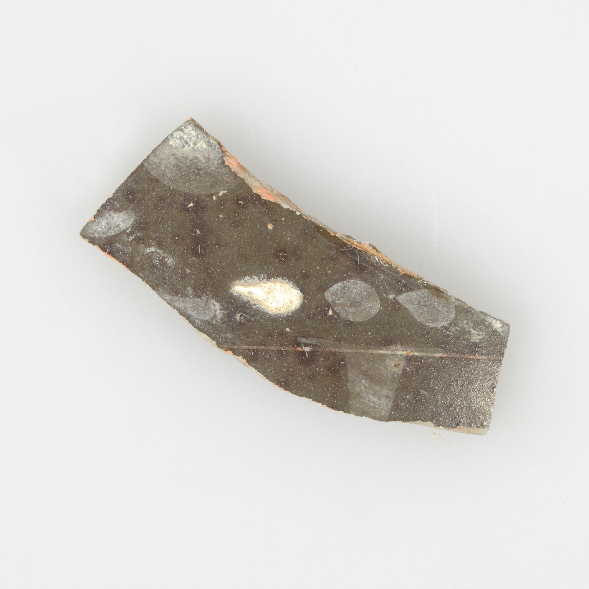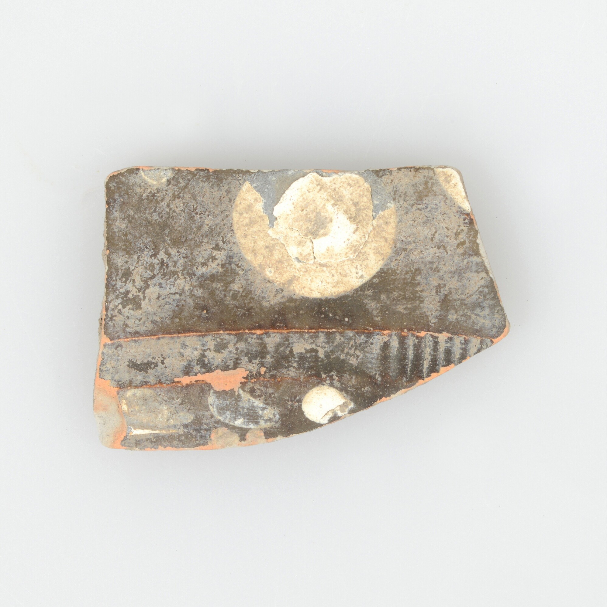 Spreukbeker; geverfd aardewerk; vier wandfragmenten met barbotineversiering