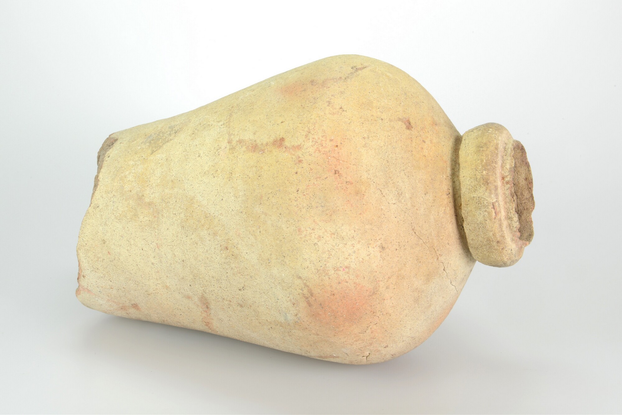 Kruik; ib-amf-; roodbakkend aardewerk; amfoor met uitgerekte peervorm en zware kraagrand, bolle bodem; herkomst: Iberisch schiereiland