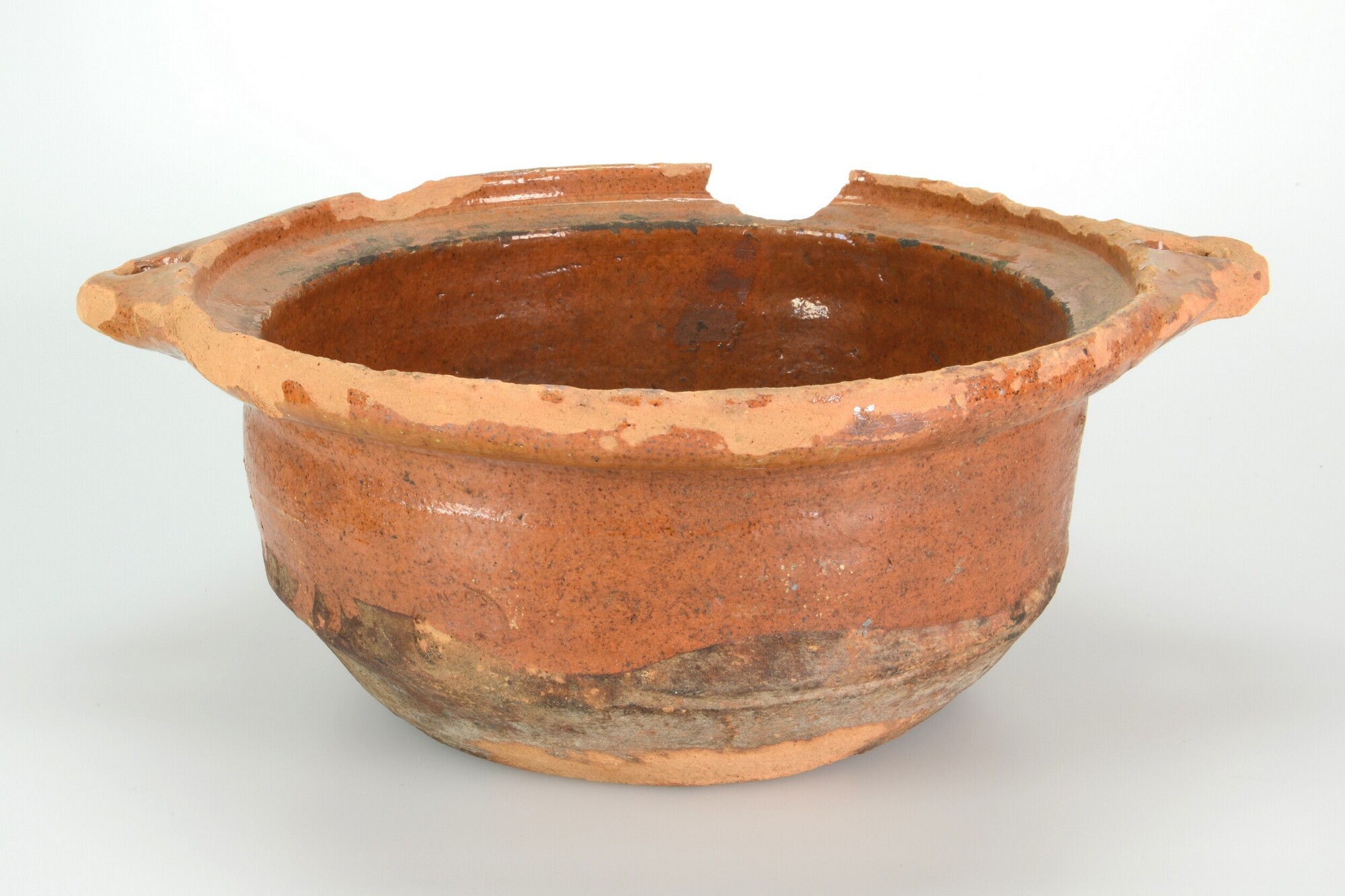 Kachelpan; r-kap-1; kachelpan met geknikte wand, afgeronde kraagrand met dekselgeul; roodbakkend; twee horizontale oren; standvlak; beroet; herkomst: Bergen op Zoom