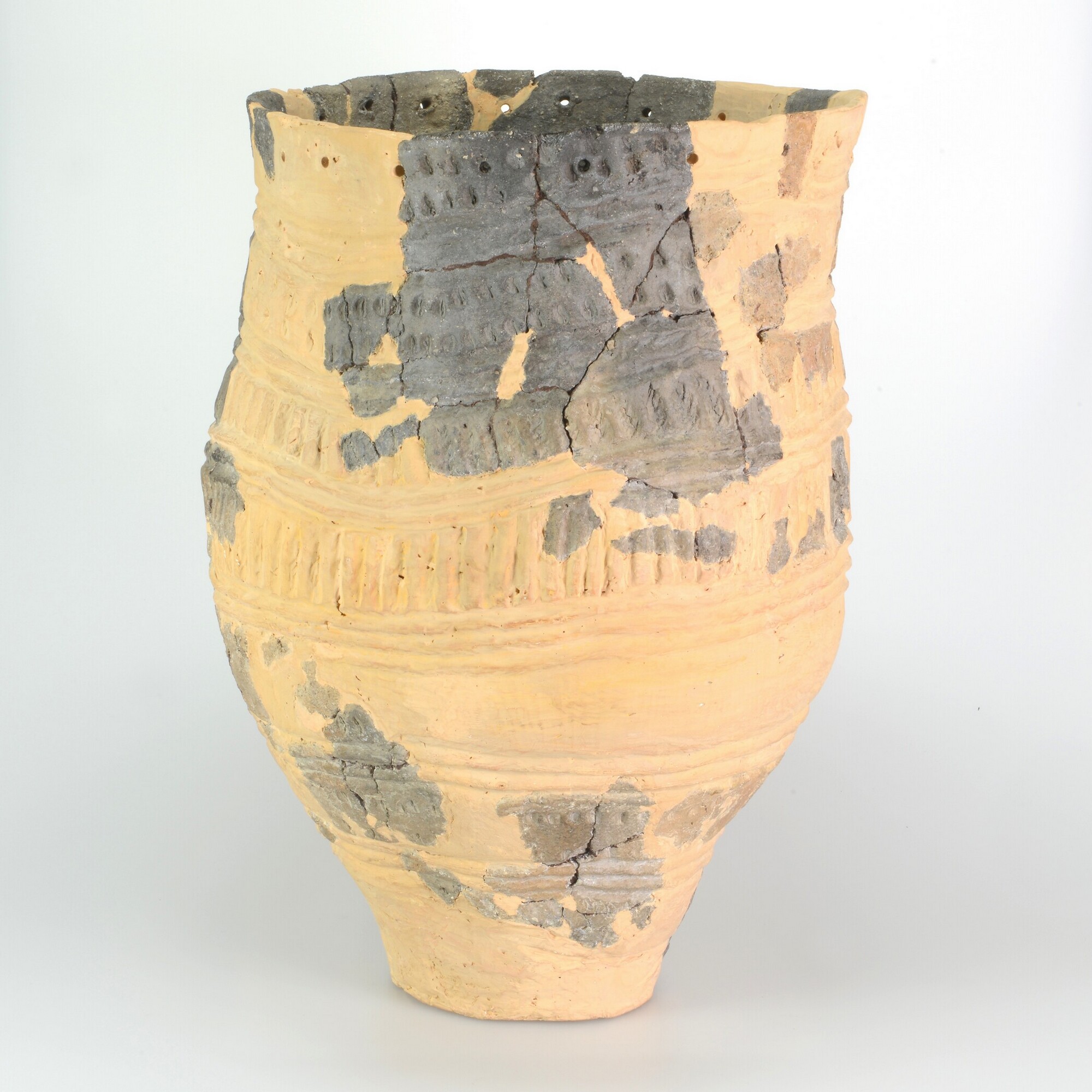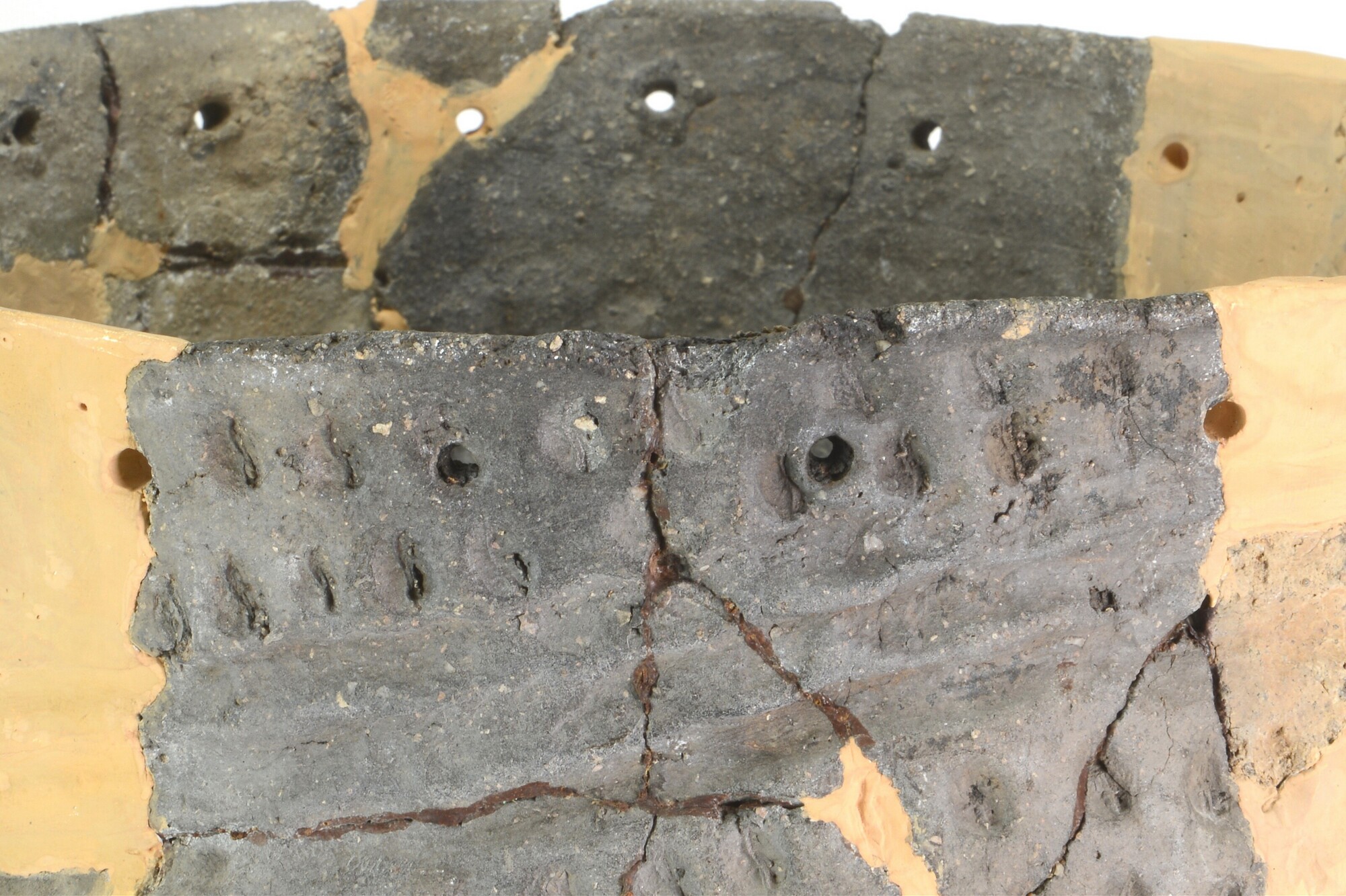 Potbeker; S-vormig profiel en gehele oppervlakte versierd met verticale en horizontale lijnen en vingertopindrukken net onder de rand. Ongeveer 2 centimeter onder de rand zijn doorboringen aangebracht met een tussenafstand van ca. 4-5 centimeter; standvoet; steengruis magering