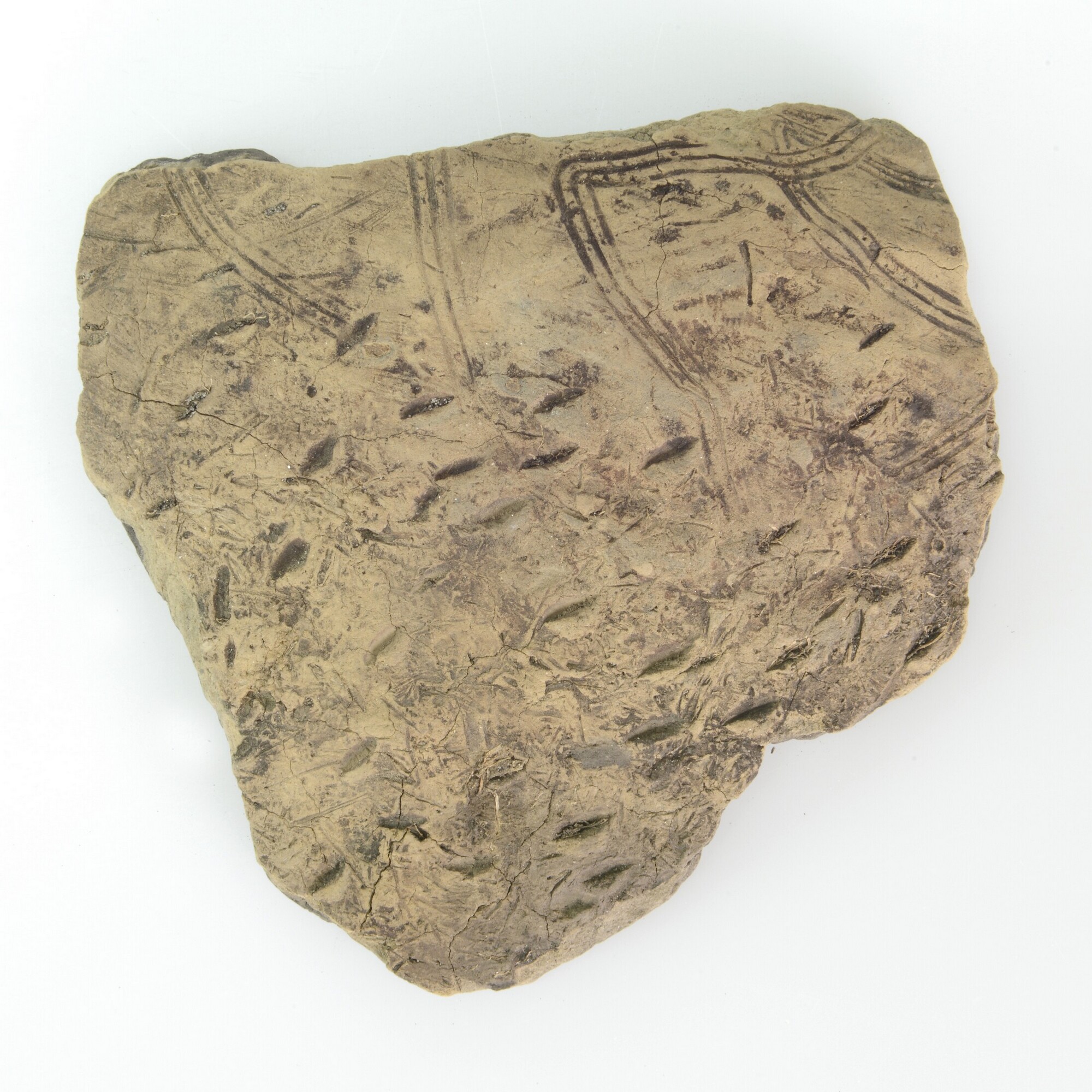Pot; drieledig model; wandfragment versierd met nagelindrukken en golflijnen en aan de binnenzijde nagelindrukken; potgruis-, planten- en zandmagering