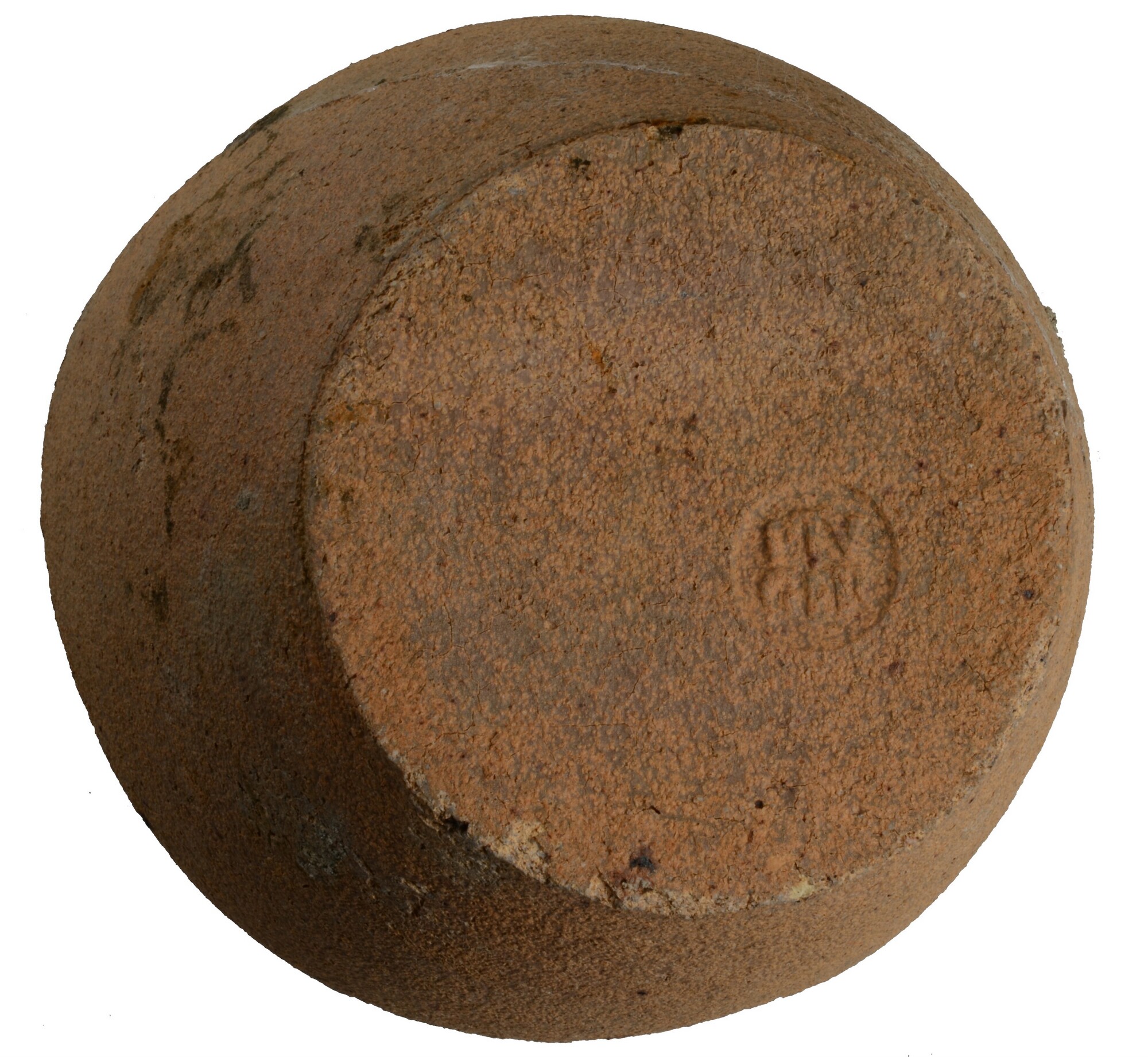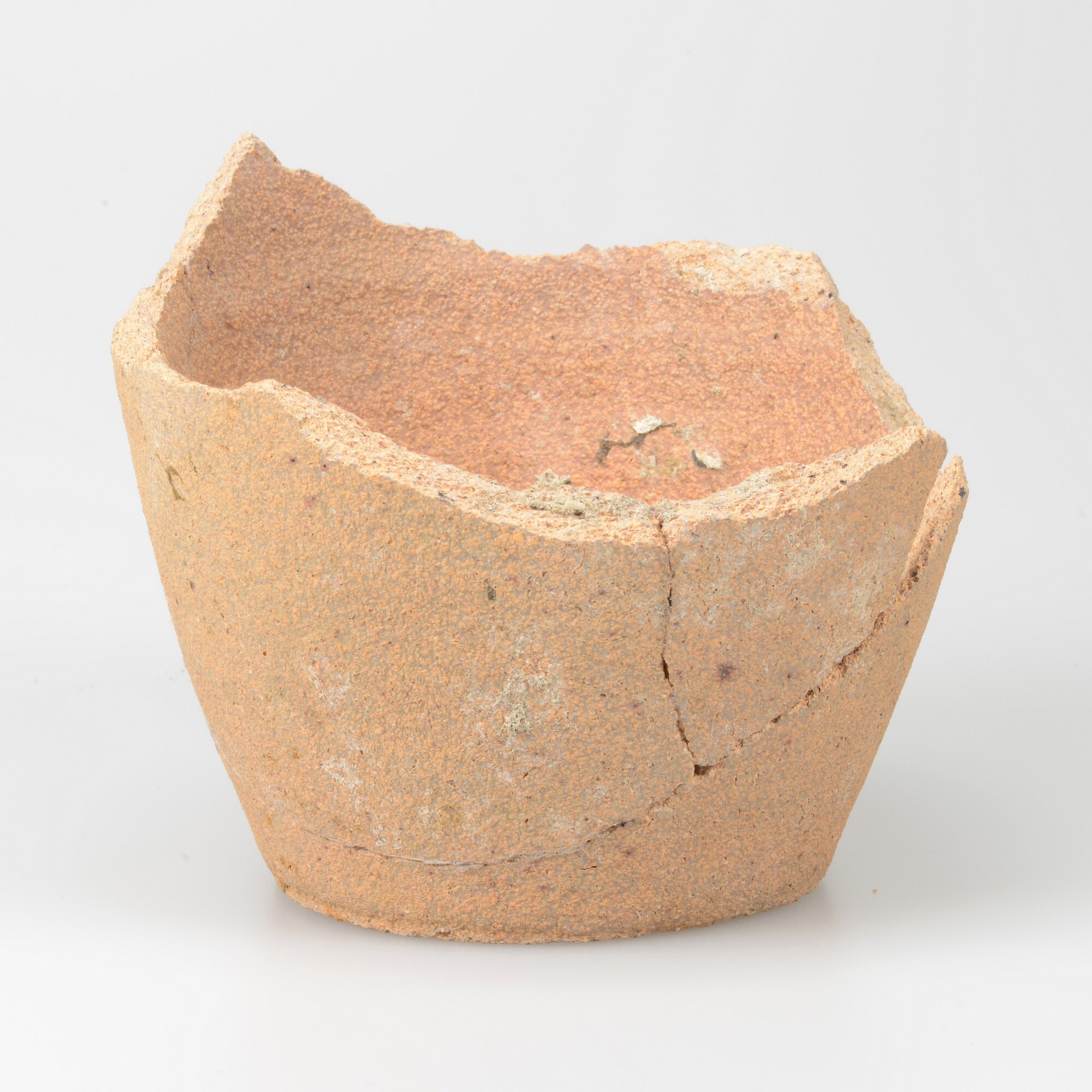 Smeltkroes; zeer grove klei; rond stempel onderzijde: PTV GER; standvlak; productieplaats: Großalmerode, Duitsland