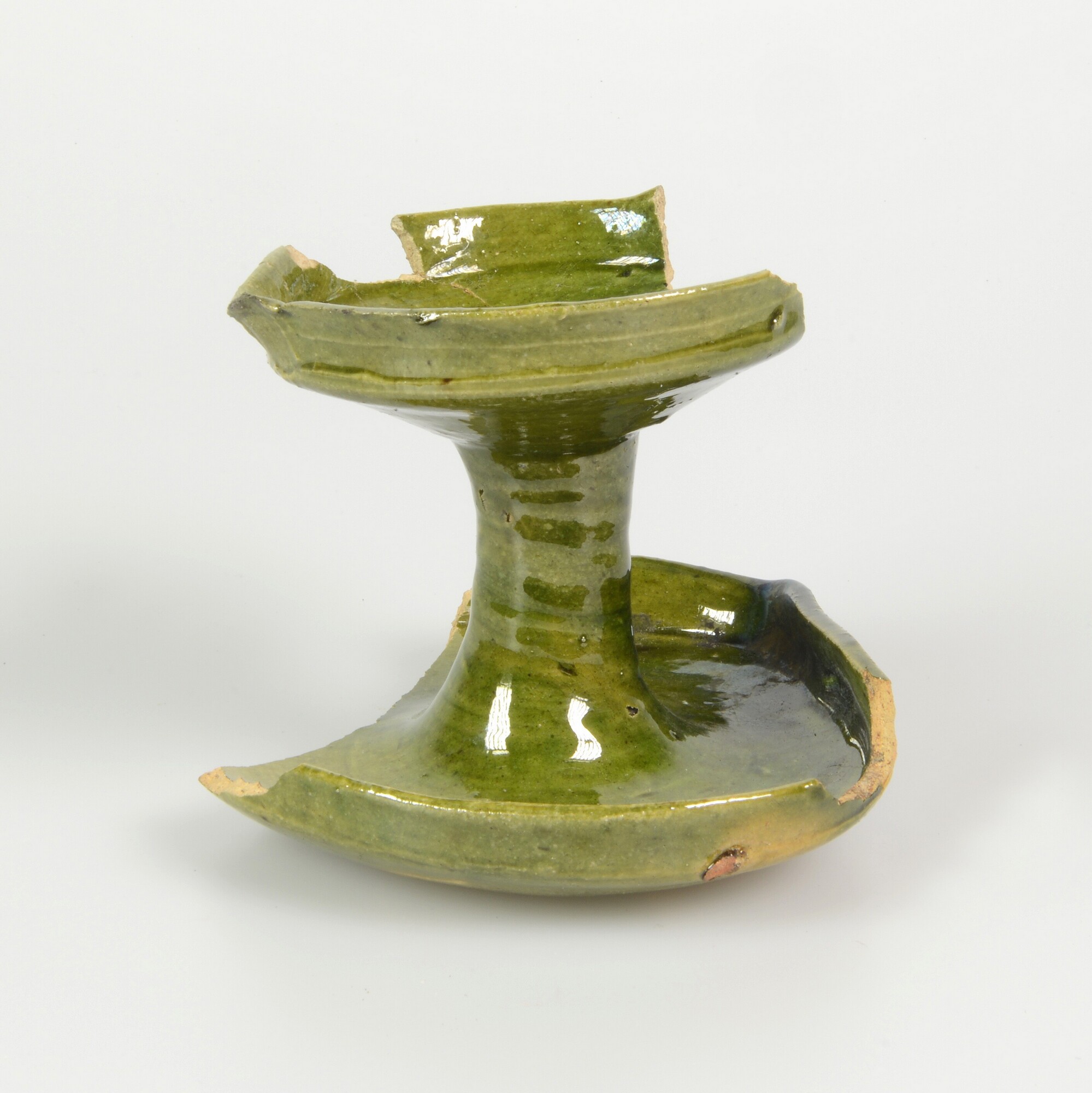 Olielamp; w-oli-2; olielamp met stam en twee schalen met geknikte rand; witbakkend aardewerk; volledig loodglazuur met koperoxide; één opstaand worstoor (ontbreekt)