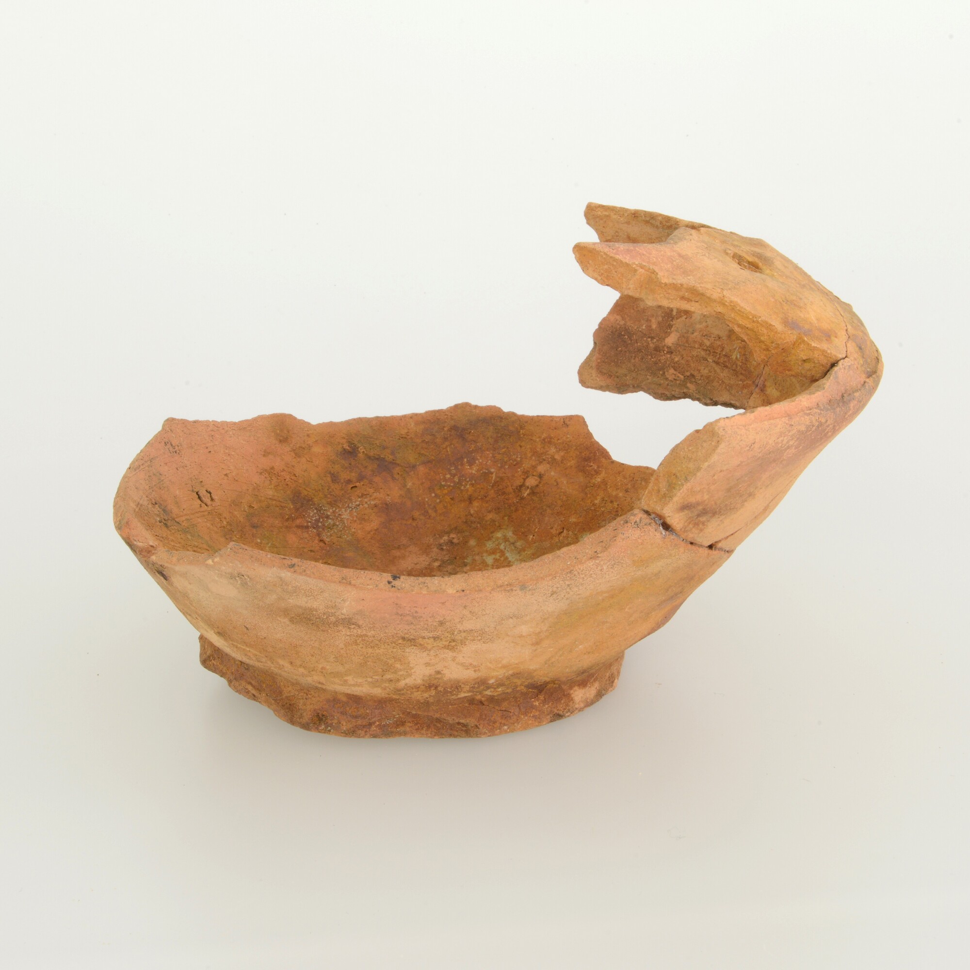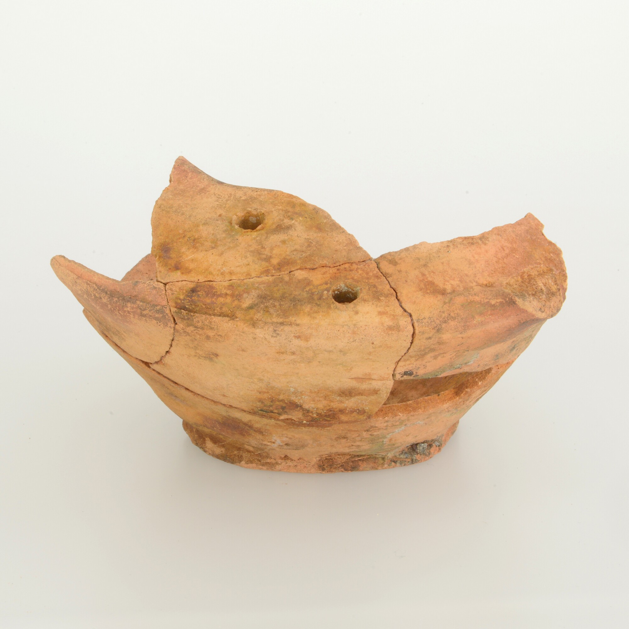Komfoor; r-kmf-38; komfoor met scherpe buikknik en naar binnen staande rechte rand; roodbakkend aardewerk; ongeglazuurd; standring; twee horizontale oren (ontbreken); gaten in schouder