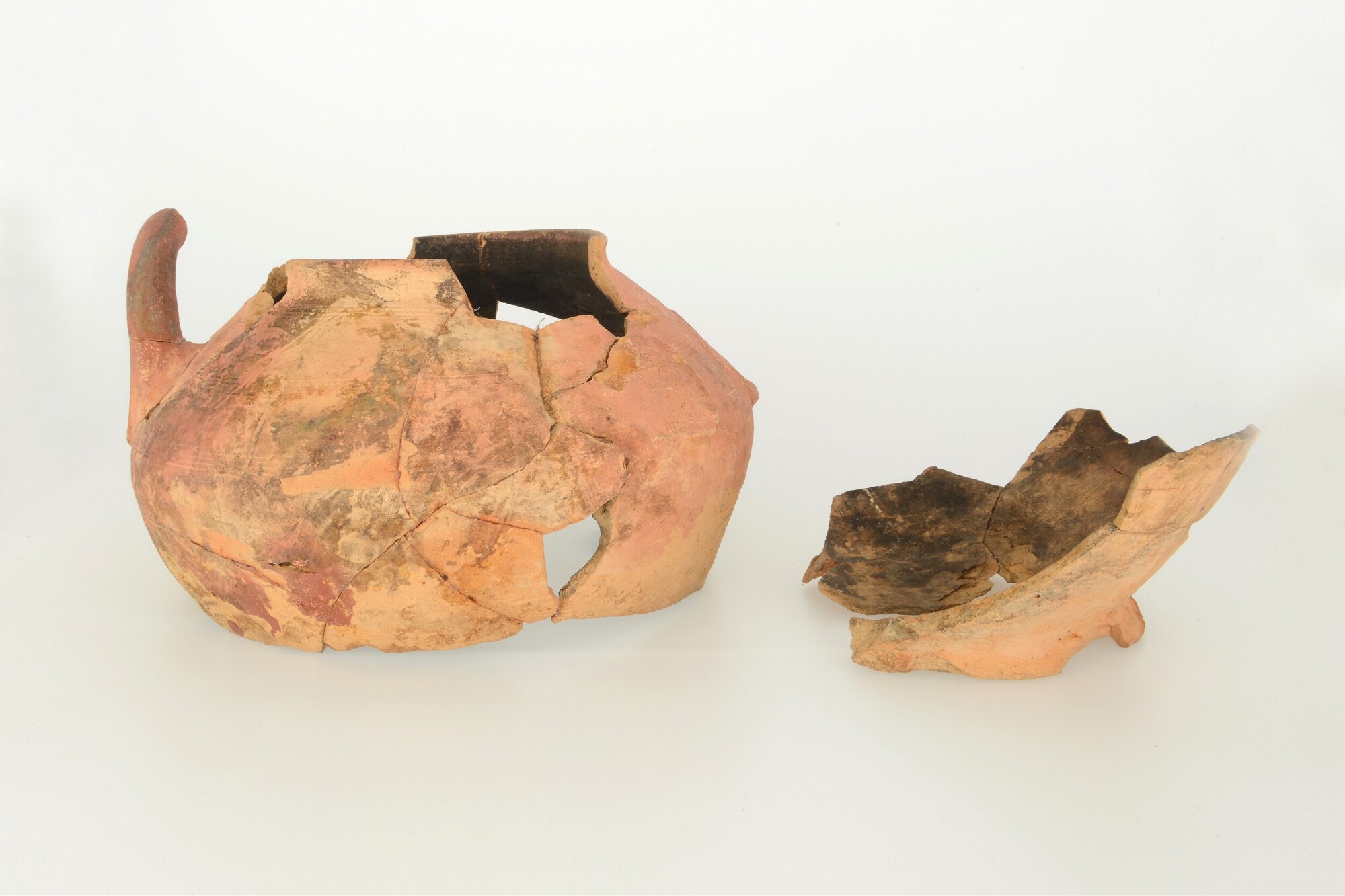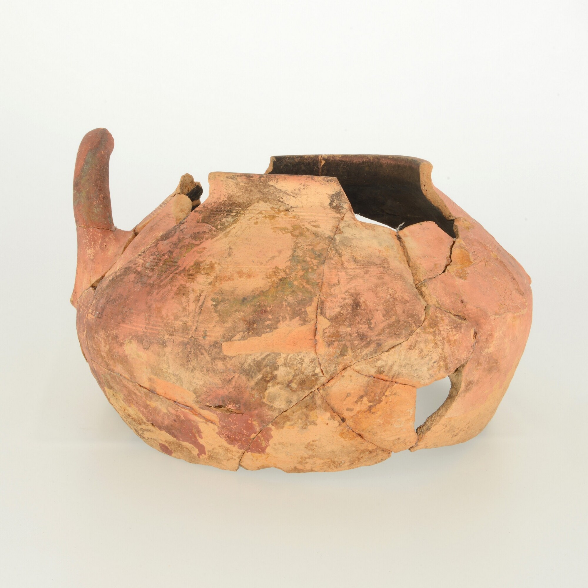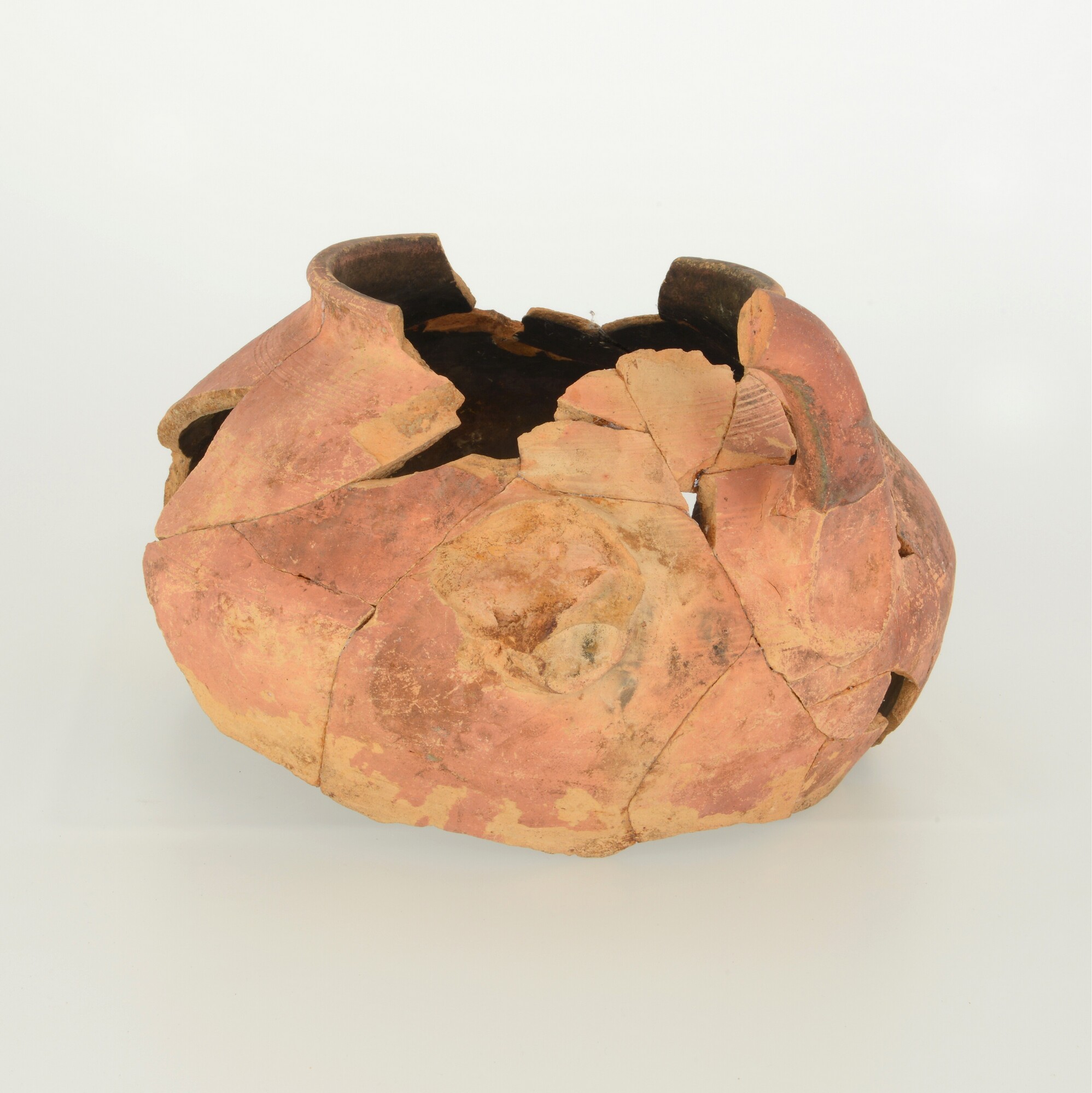 Pot; r-pot-3; bolle pot met hoge schouder en opstaande lip met dekselgeul; roodbakkend aardewerk; ongeglazuurd; standring; twee opstaande worstoren; inwendig beroet; kamstreek op schouder; vermoedelijk secundair gebruikt als aspot