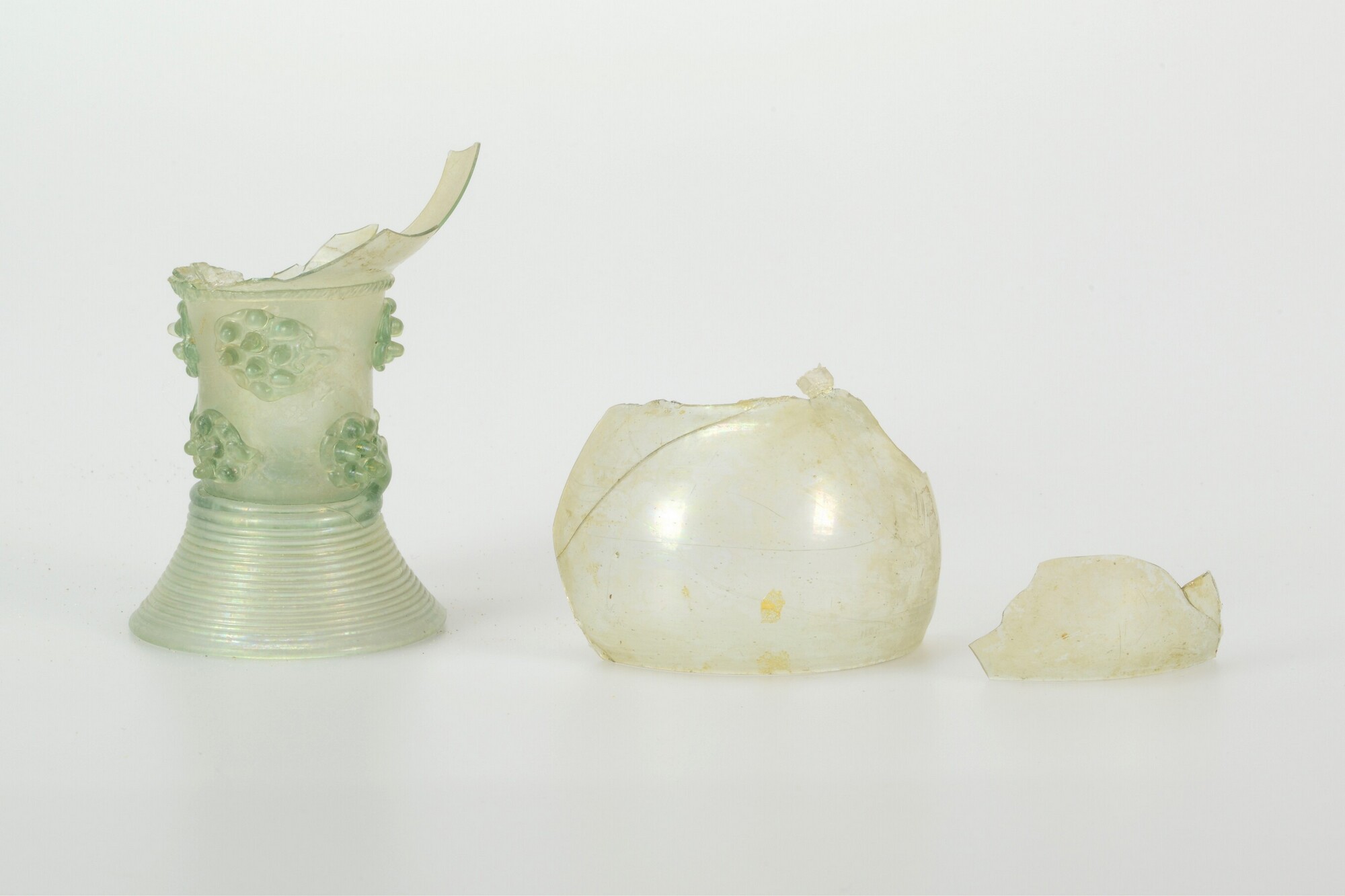 Roemer; gl-roe-1; glas; groen; twee verspringende horizontale rijen van vier braamnoppen; gewonden draadvoet, pontilmerk; brede cuppa, gewonden voet; herkomst: Duitsland of Nederlanden