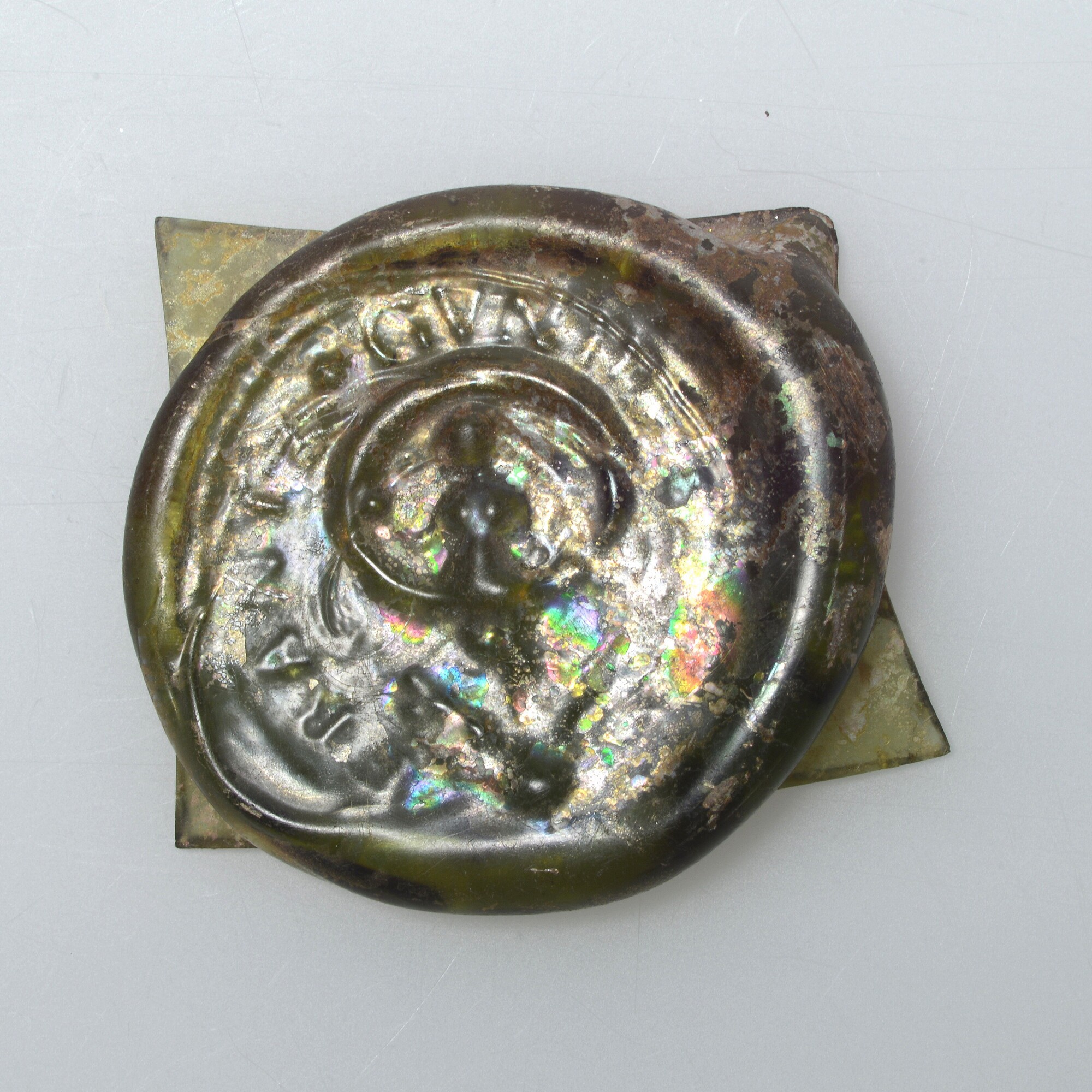 Glaszegel; gl-fle-; glas; groen; zegel: Fortuna staand als een godin op de aardbol dat welvaart en geluk symboliseert. Op de zegel is het omschrift zichtbaar FRANTZ GVNDELACH; productiegebied: Holstein, Duitsland