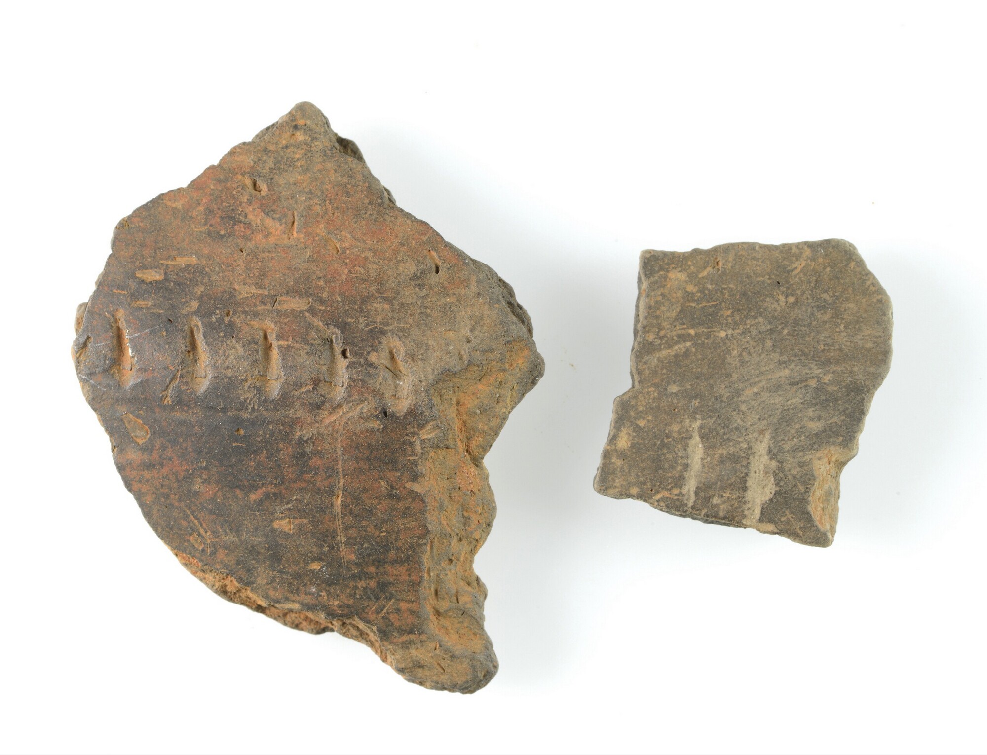 Pot; twee wandfragmenten; verticale vingernagelversiering op de wand; donkerbruin/grijs baksel