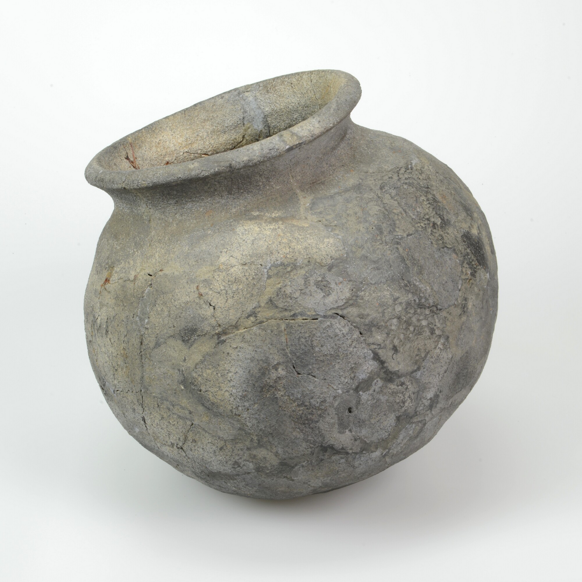 Kogelpot; kp-kog-; bolvormig potlichaam met korte hals en een dakvormige, afgeschuinde rand en lensvormige bodem; steengruis magering