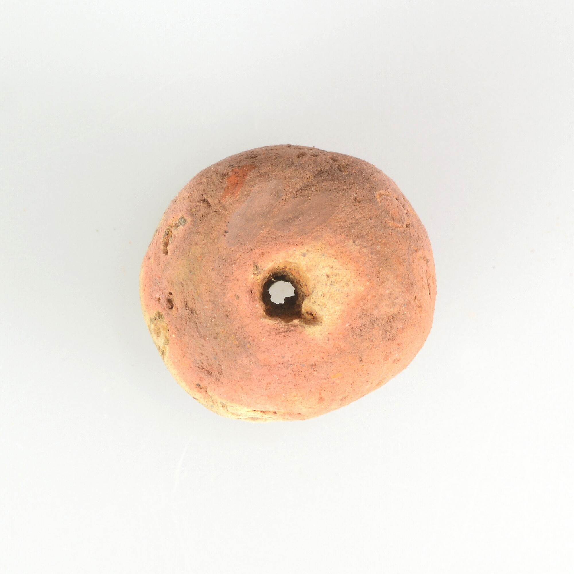 Kraal; ronde kraal met drie rijen cirkelversiering; doorboring; rood/beige baksel