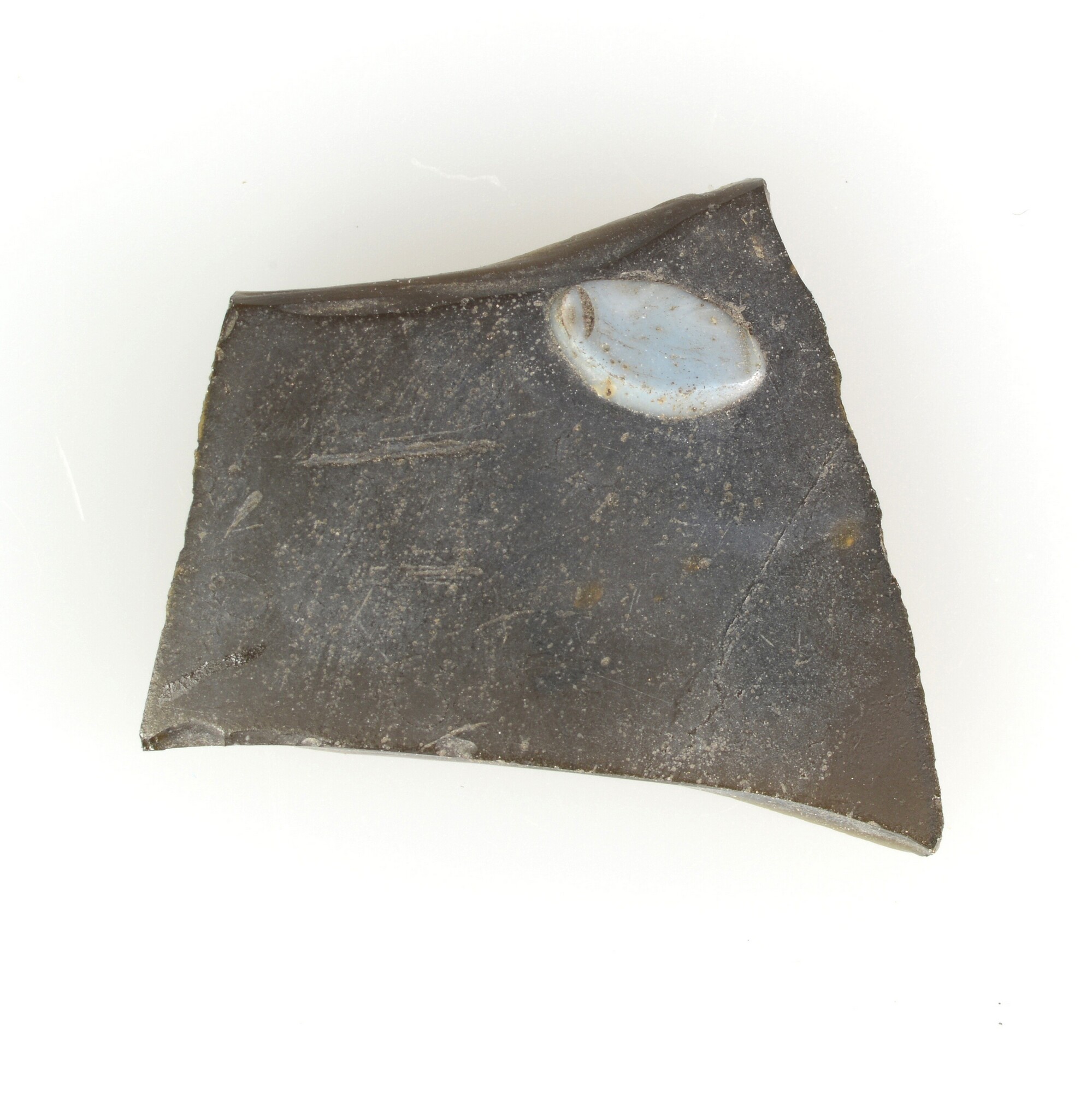 Glas; paars; wandfragment versierd met opaque witte kiezelsteen