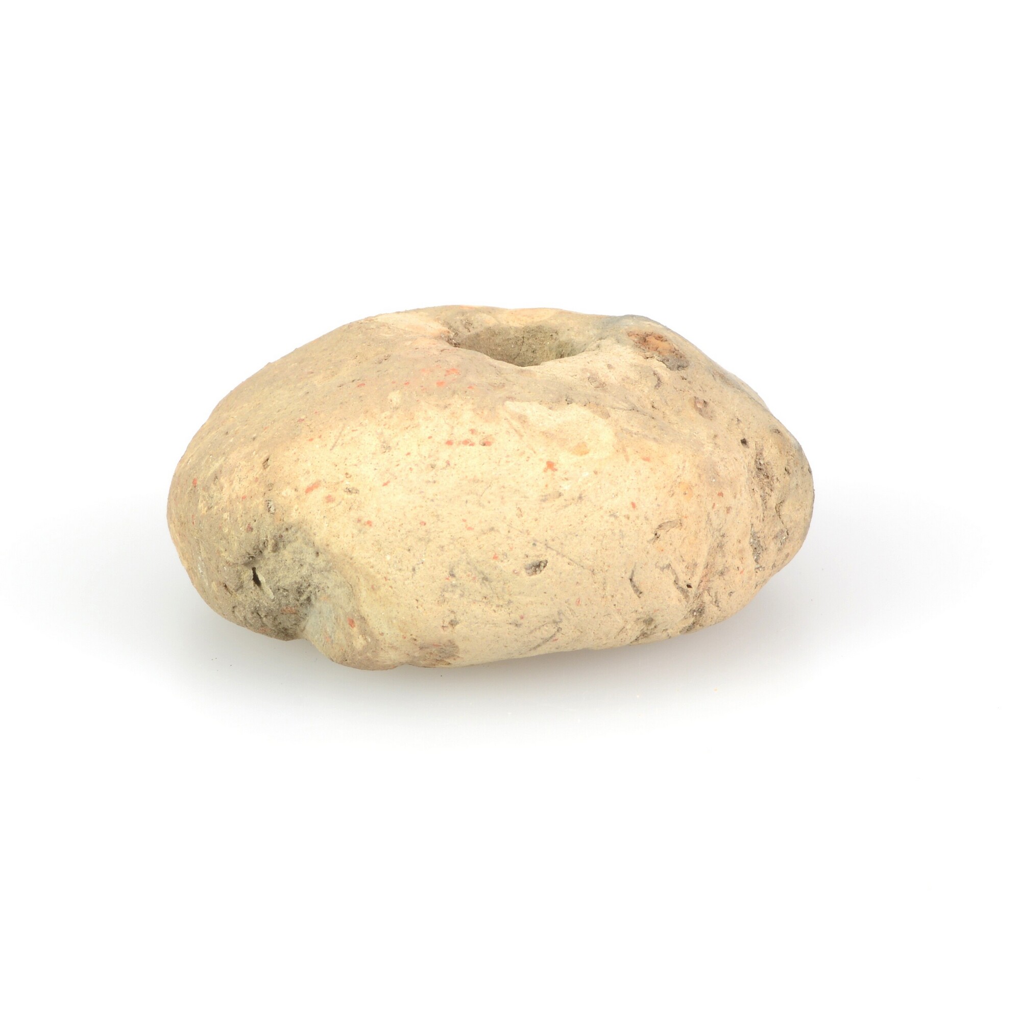 Spinsteen; inheems-romeins aardewerk; bolle zijden en een iets biconische vorm; potgruis magering; bruin baksel