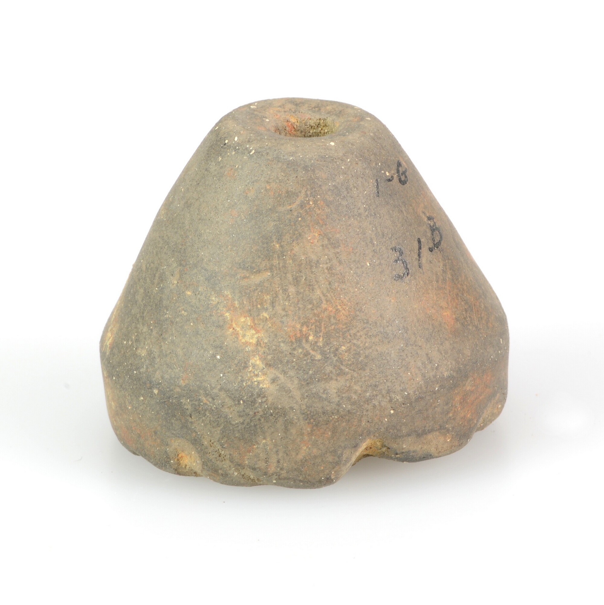 Spinsteen; type C1; inheems-romeins aardewerk; dubbelconisch met concave zijden en vlak aan boven- en onderzijde; bruin/grijs baksel