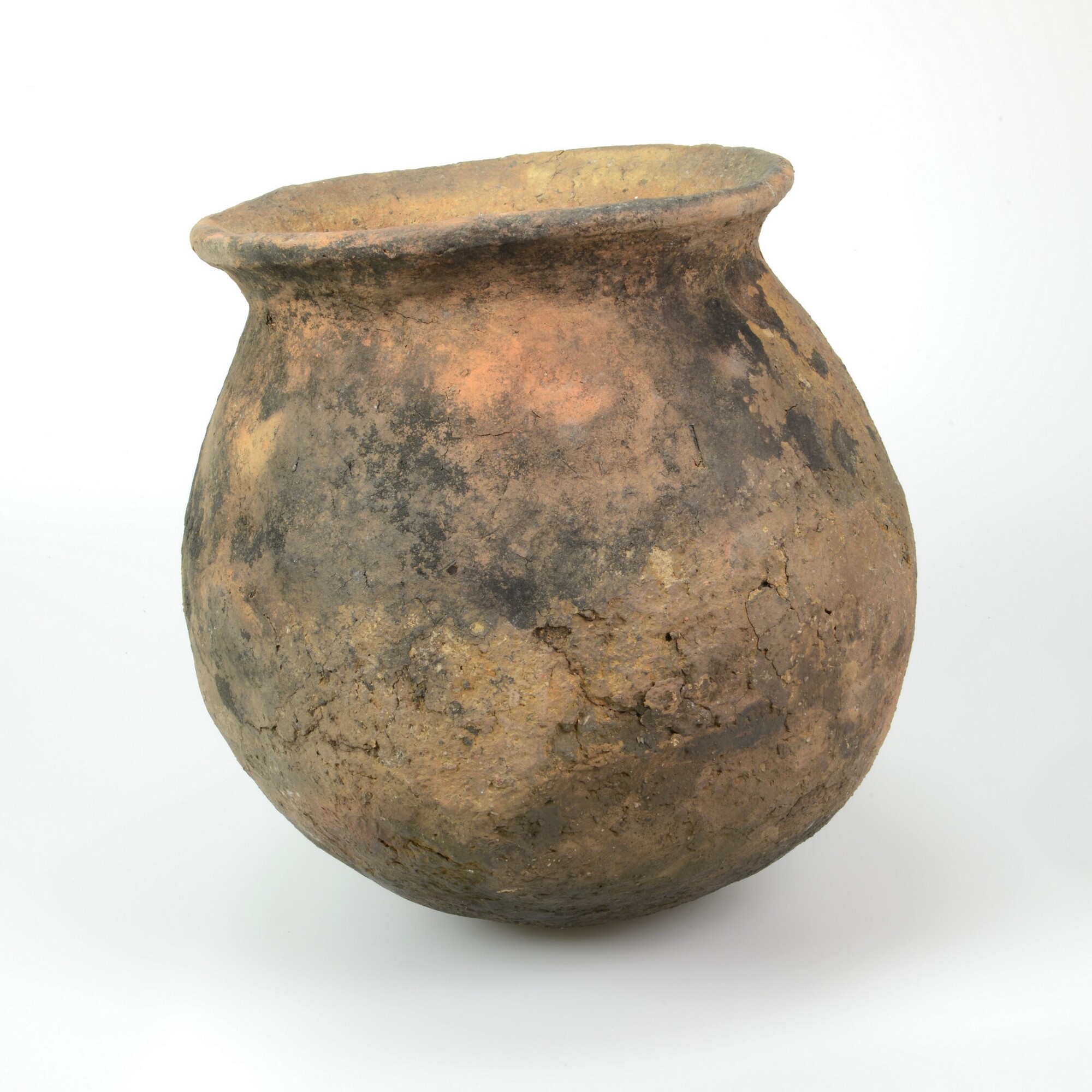 Kogelpot; kp-kog; bolvormig potlichaam met korte hals en een afgeronde rand en lensvormige bodem; steengruis magering; uitwendig beroet