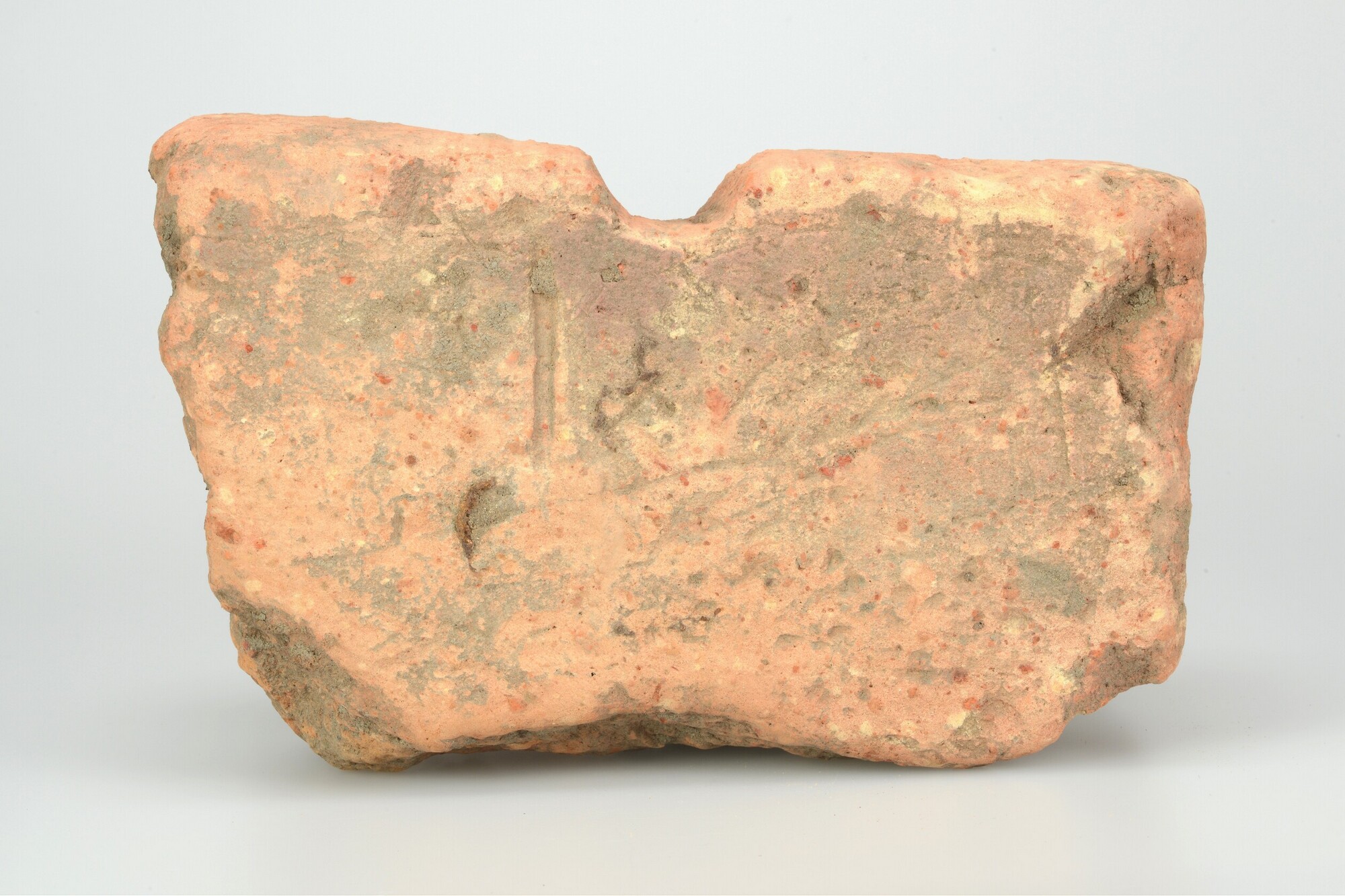 Spitlager ?; onderdeel van een spit; baksteen met inkeping in de lange zijde; rood baksel