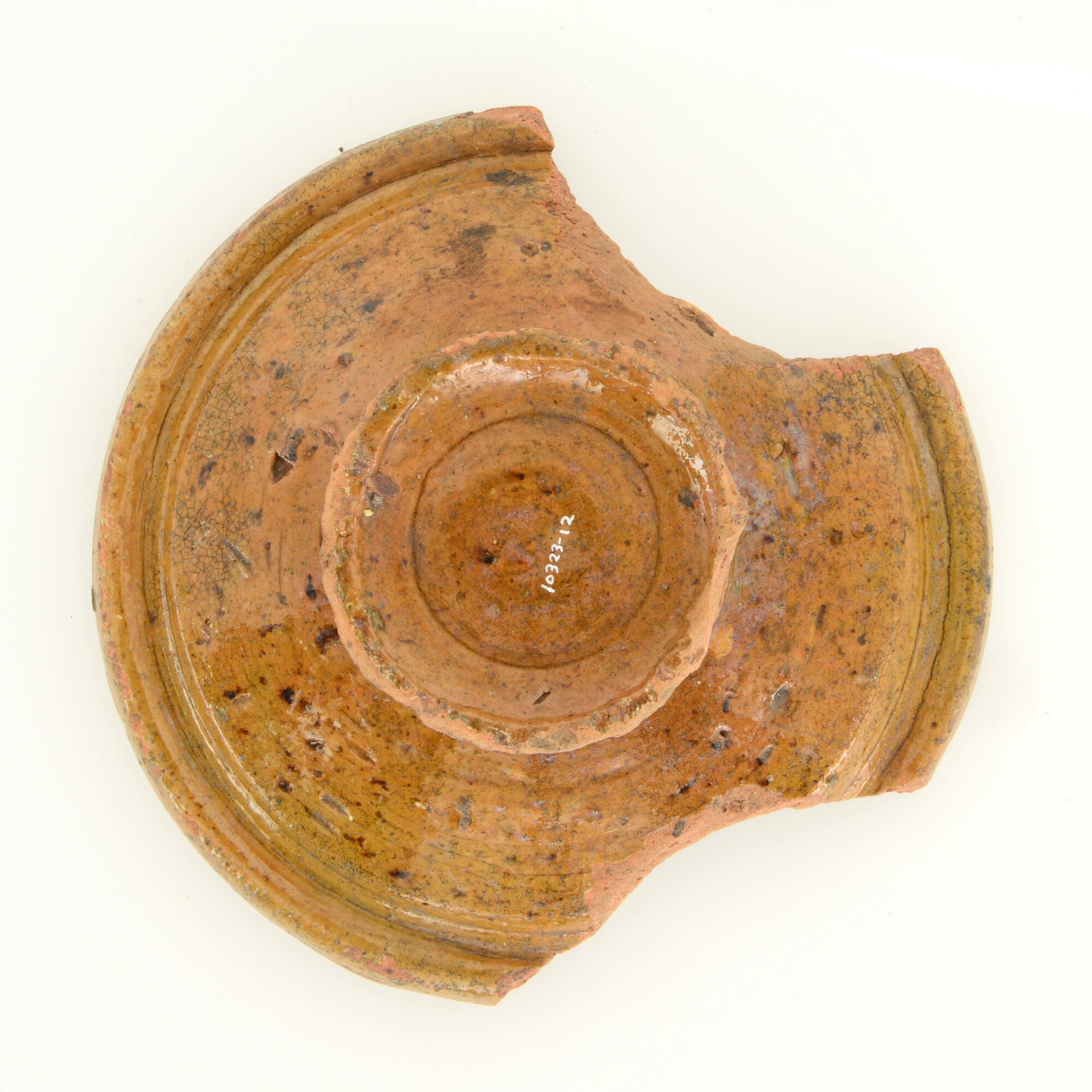 Bord; r-bor-3; bord zonder vlag met afgeronde kraagrand; roodbakkend aardewerk; loodglazuur; standring
