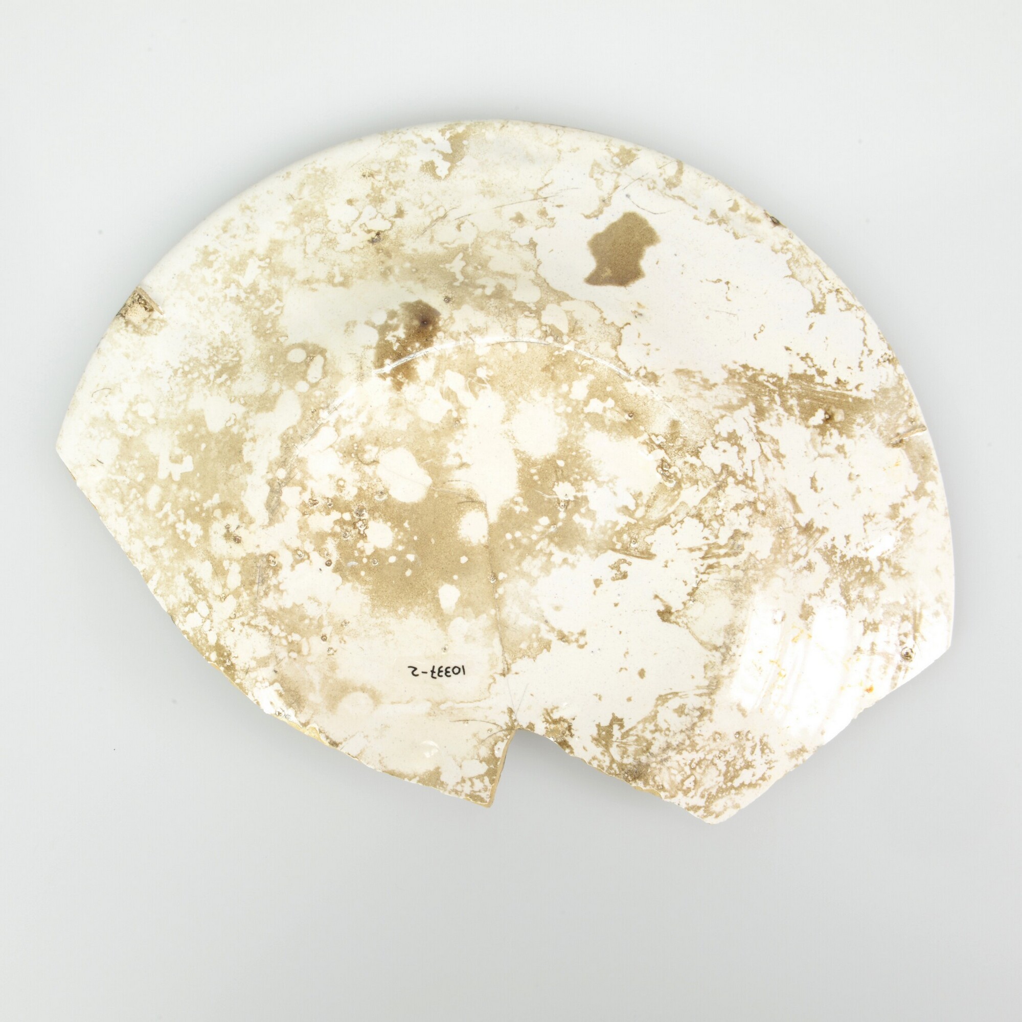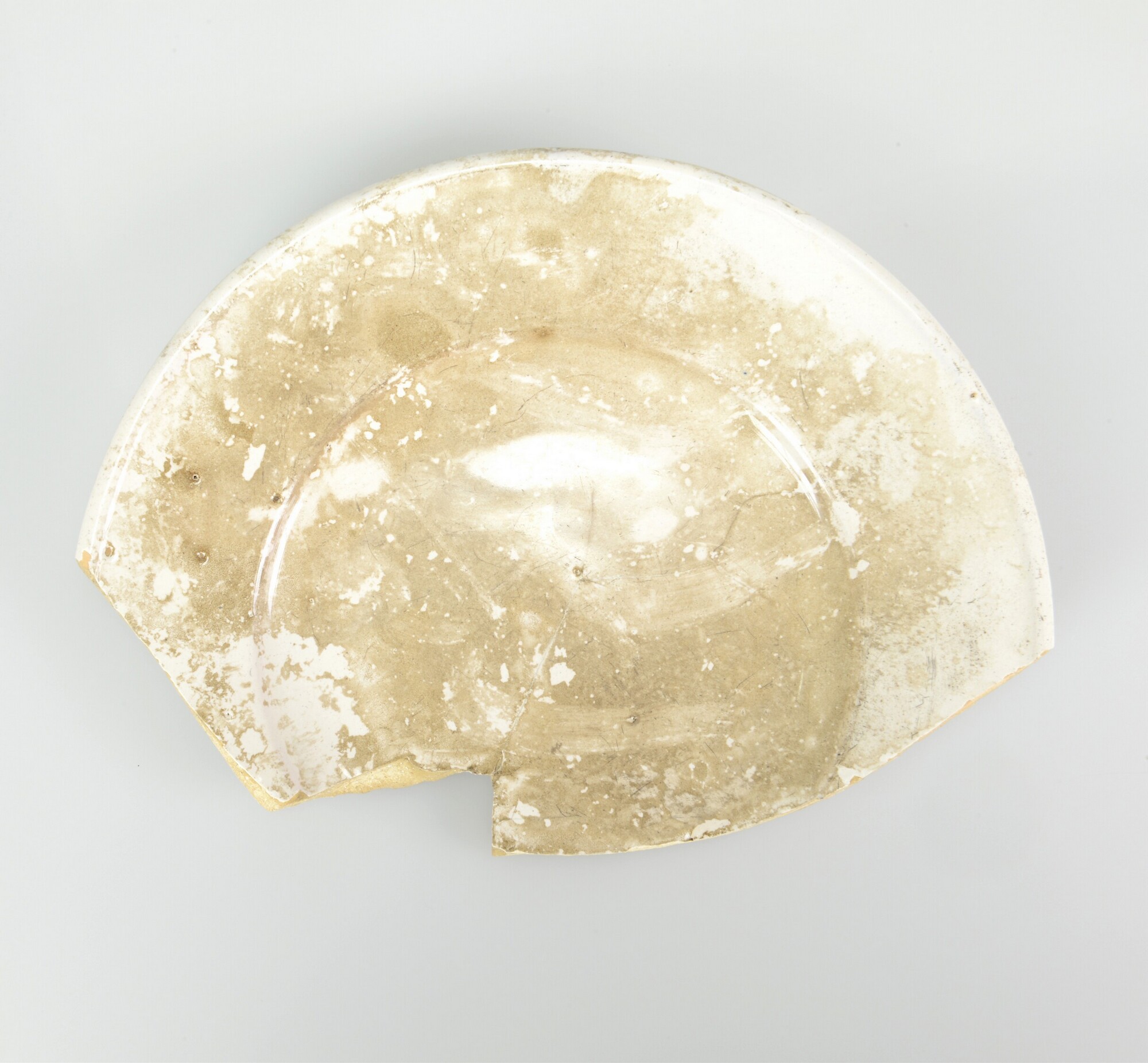 Bord; f-bor-5; afgerond bord met platte bodem en smalle vlag; faience; tinglazuur; geheel wit; standvlak