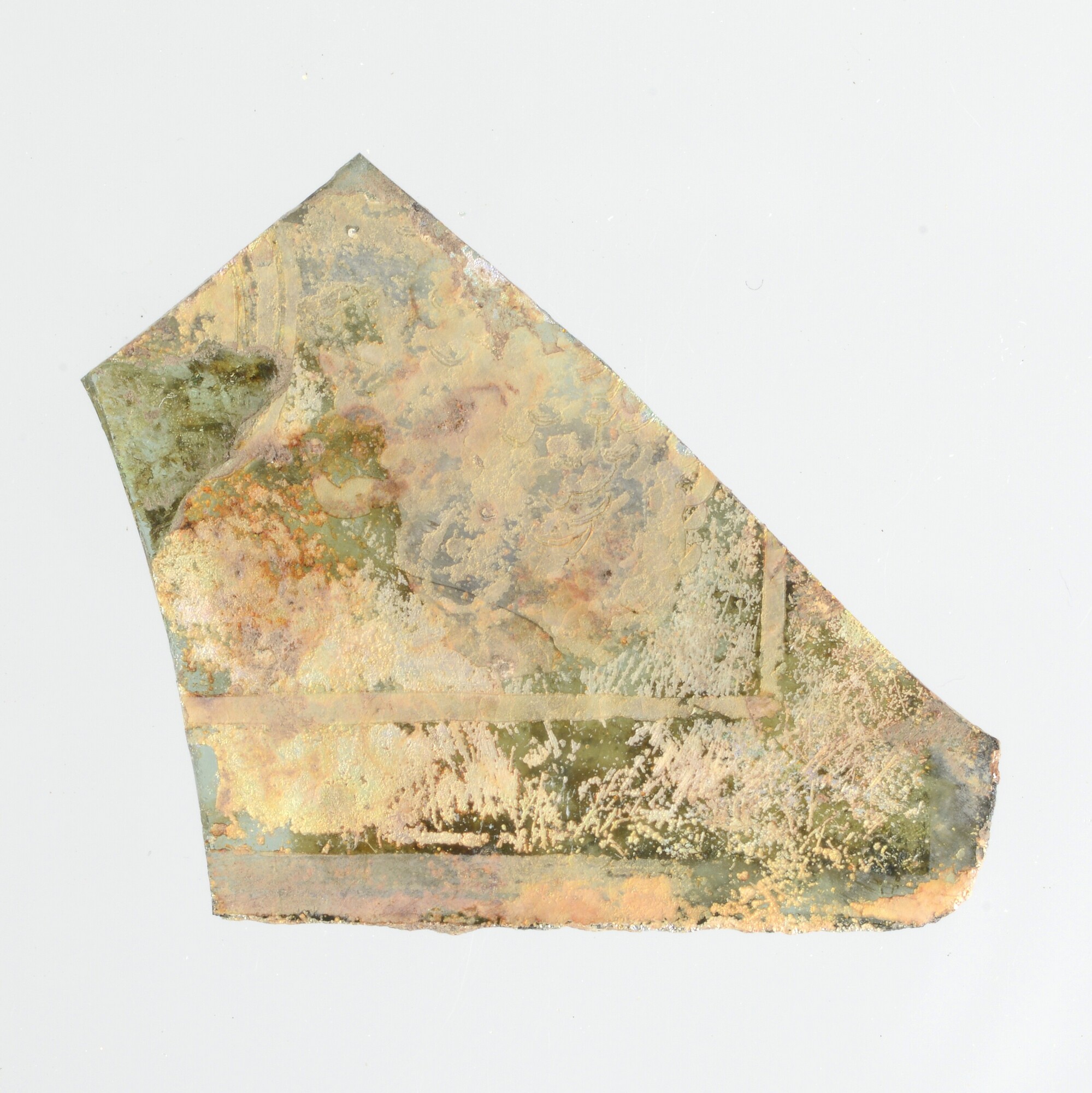 Gebrandschilderd glas; groen; hoekfragment met binnen een strak geschilderde hoek een wolkachtige structuur met fijne details