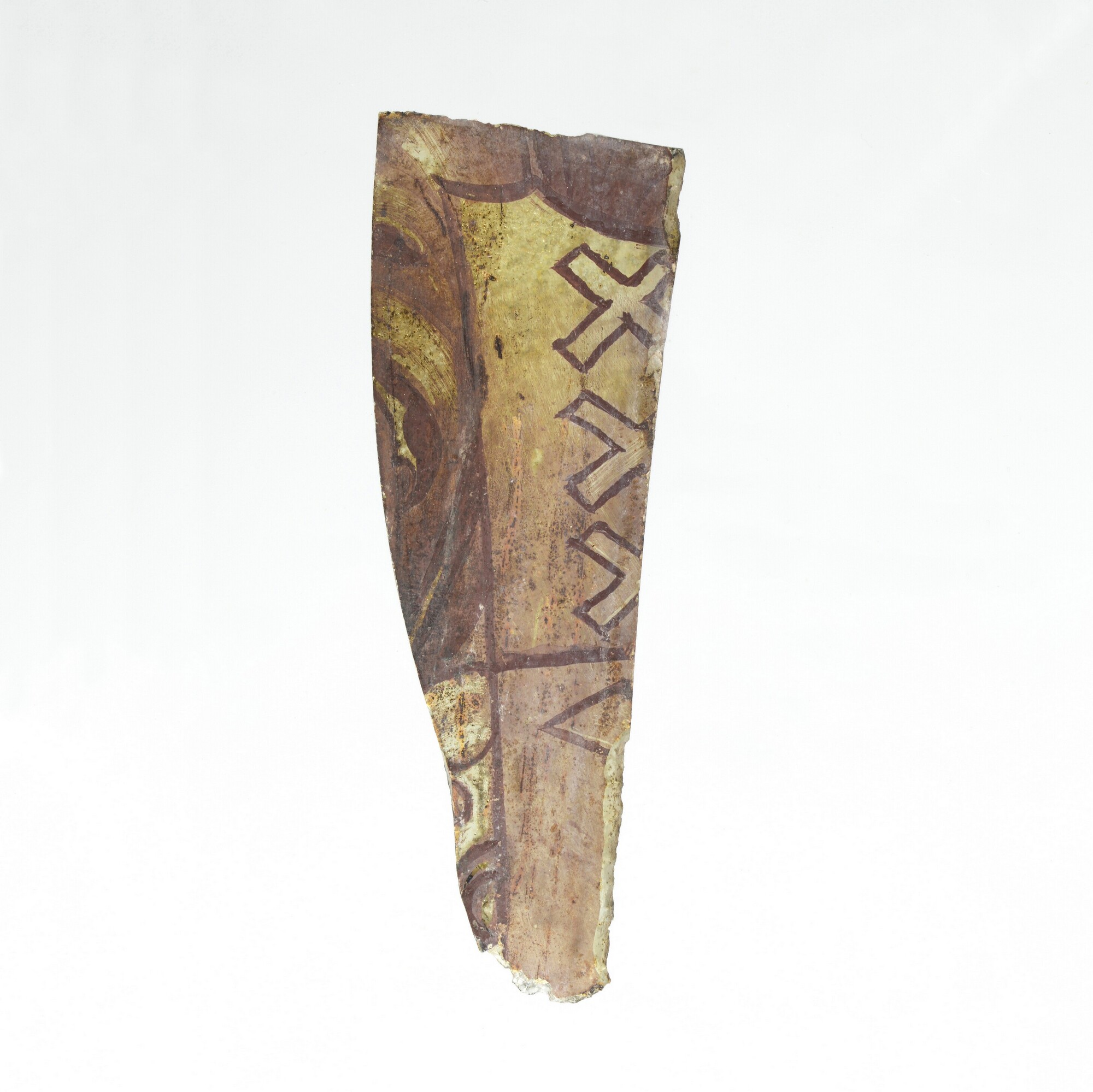 Gebrandschilderd glas; groen; drie Andries-kruisen (wapen van Amsterdam). Deze lijken onderdeel uit te maken van een banier waardoor de zwarte lijnen als scheepstouw kunnen worden geinterpreteerd. Links van de banier is het glas beschilderd met vlotte penseelstreek in roodbruine kleur