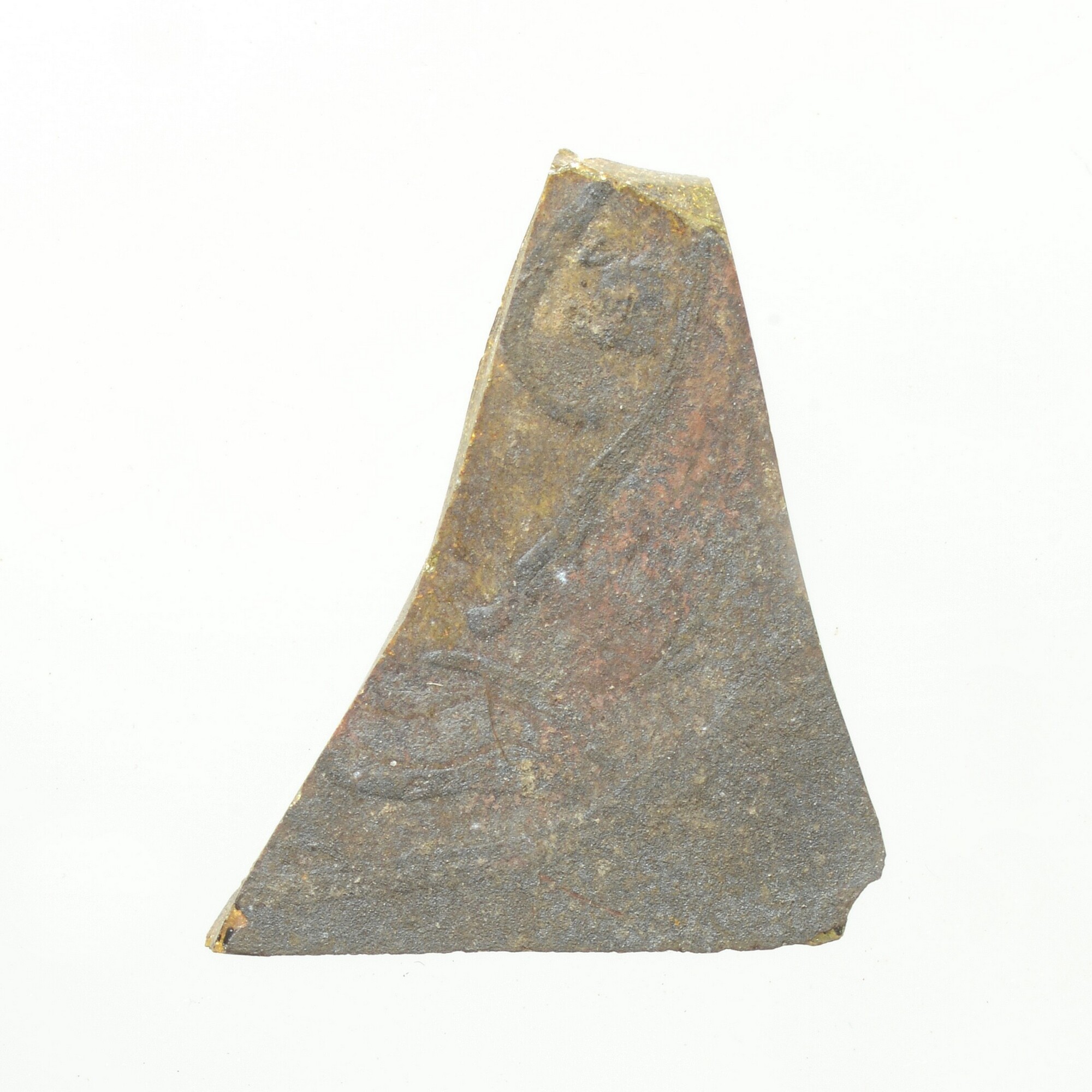 Gebrandschilderd glas; groen; fragment van een gezicht. Gelokt haar met een scheiding boven het rechteroog. Een zwaar aangezette wenkbrauw en een gedeelte van de neus