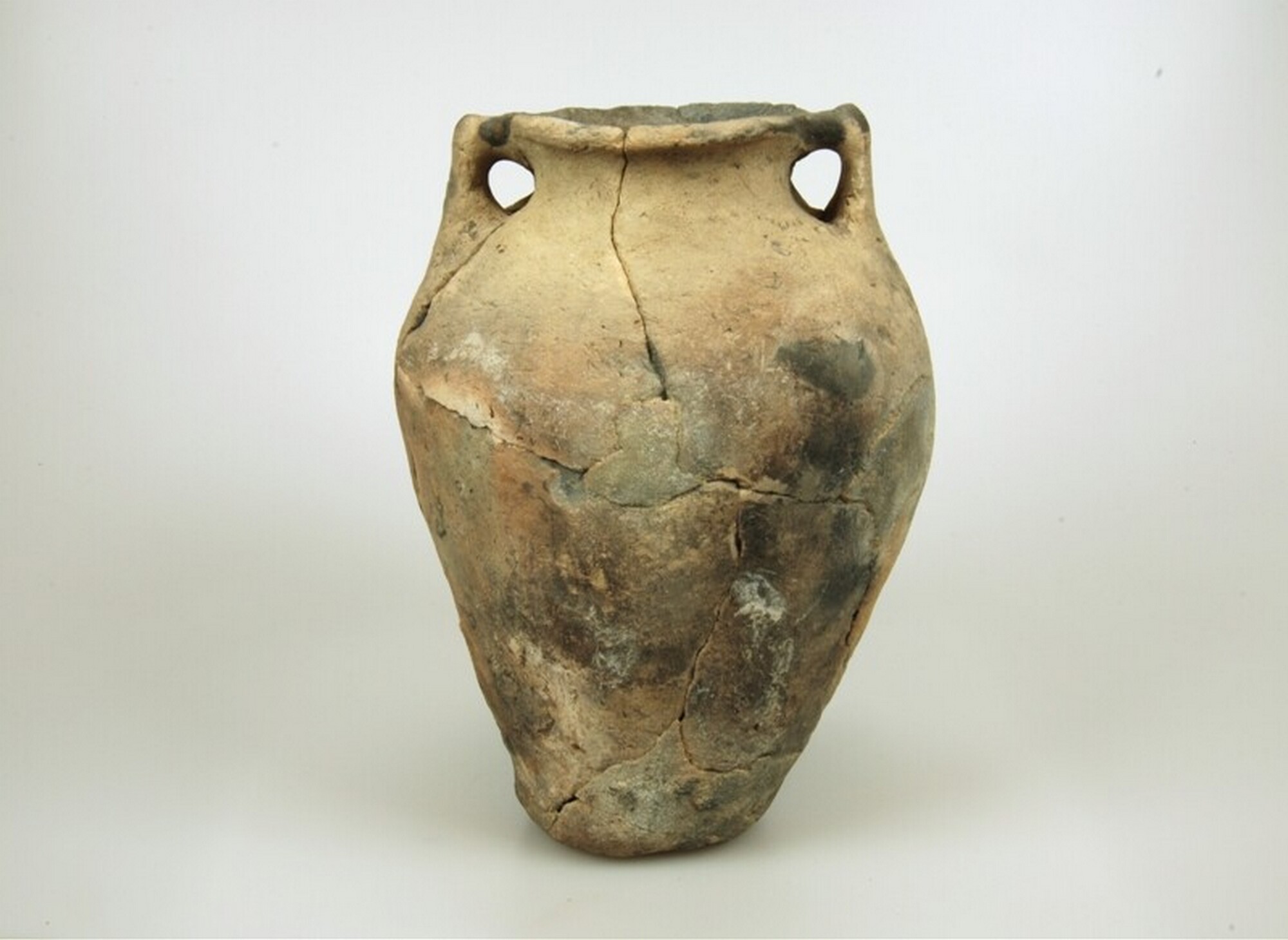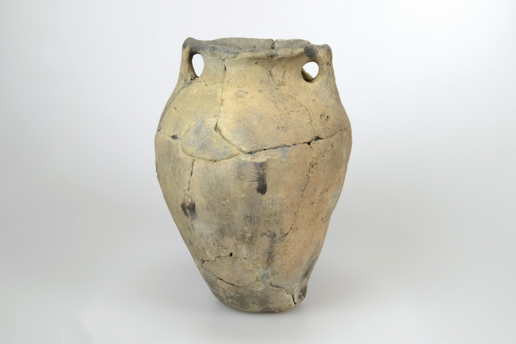 Pot; type Diederik O-III; inheems aardewerk; nauwmondige slanke pot met twee knobbeloren; standvlak; vondstomstandigheden: waterput 4