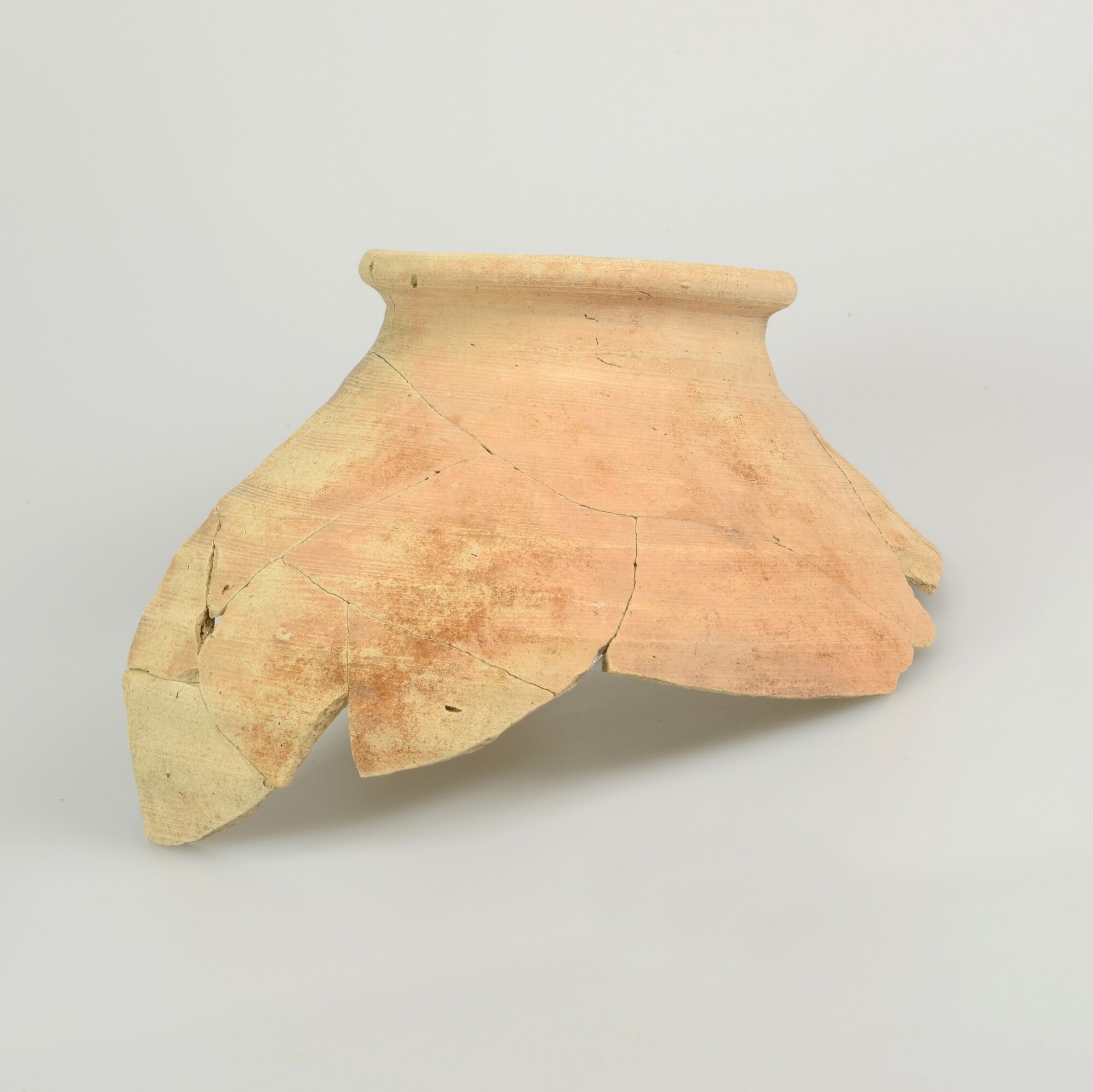 Kruik/fles; baksel W IX; hoge pot met bolvormig potlichaam en een verdikte, naar buiten staande rand; Badorf waar; randfragment; geel baksel