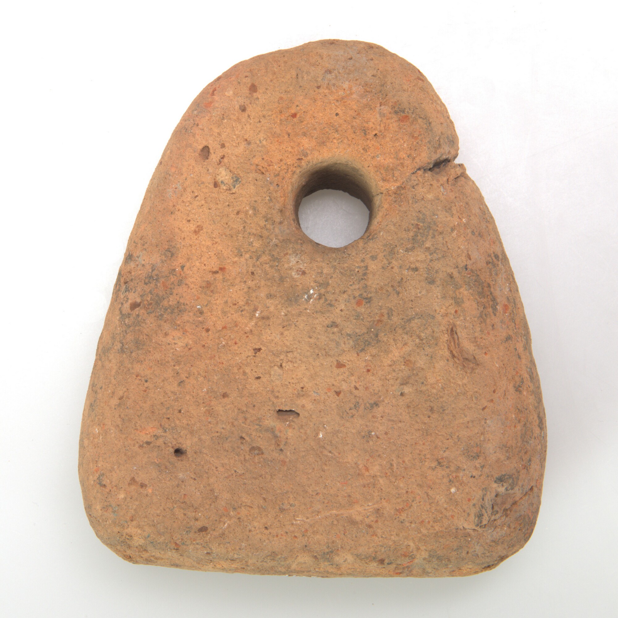 Netverzwaarder; roodbakkend aardewerk; ongeglazuurd; rond gat aan bovenzijde
