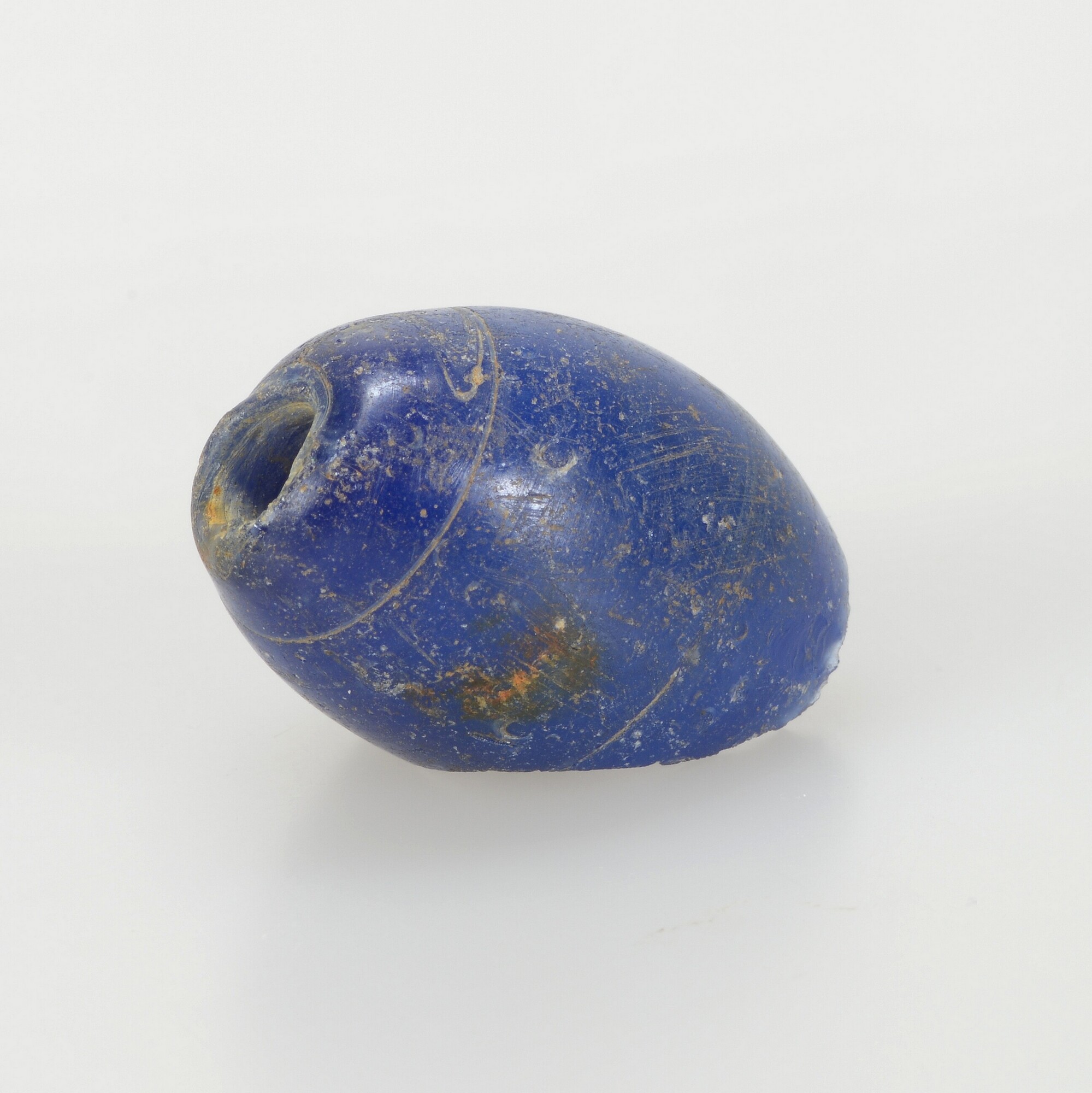 Kraal (fragment); kobaltblauw glas; ovoïde met doorboring; herkomst: Bohemen of Beieren