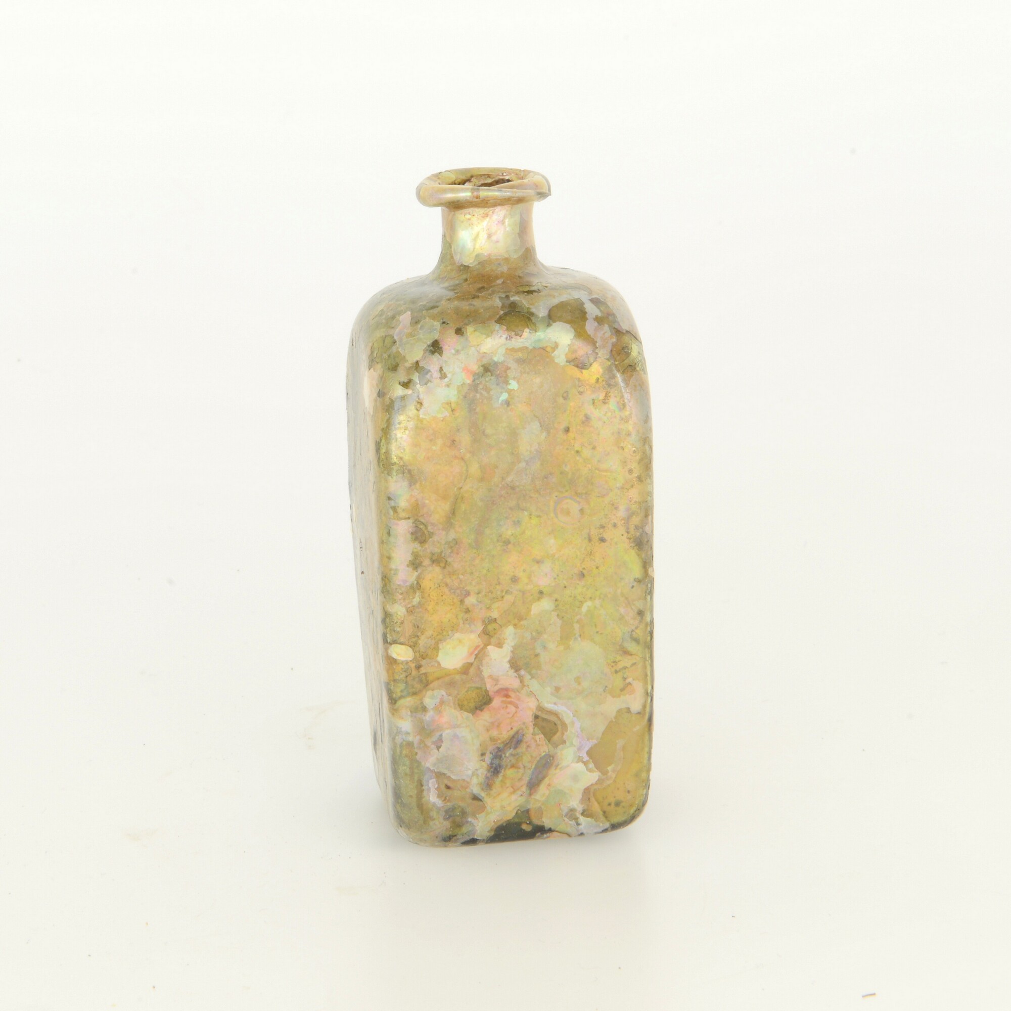 Fles; gl-fle-; glas; groen; opgestoken pontilmerk; indoopvorm, vierzijdig; herkomst: Duitsland of Nederland?
