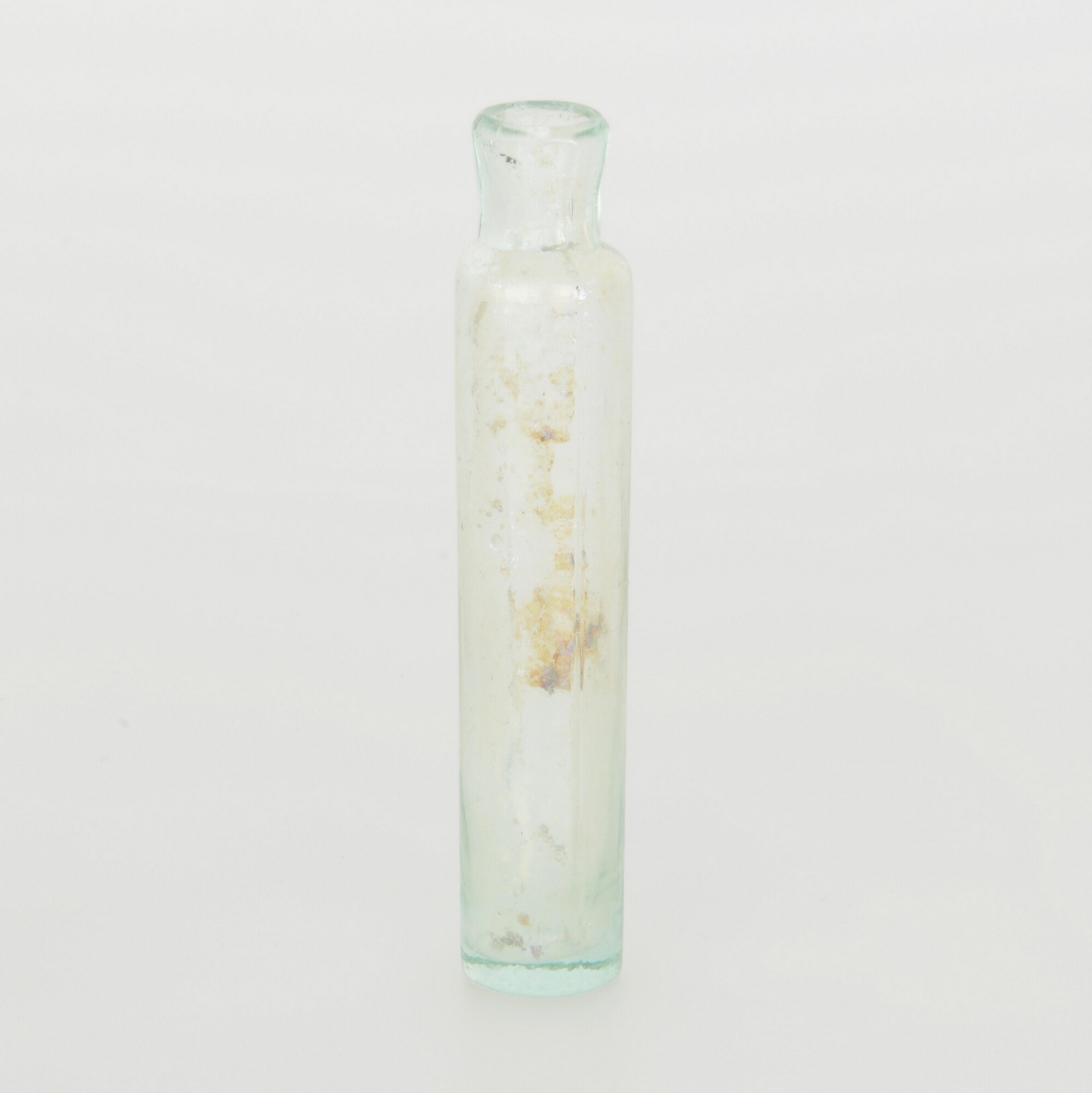 Medicijnfles; gl-fle-50; glas; groen; standvlak; contactvorm, twee verticale naden; herkomst: Nederland?