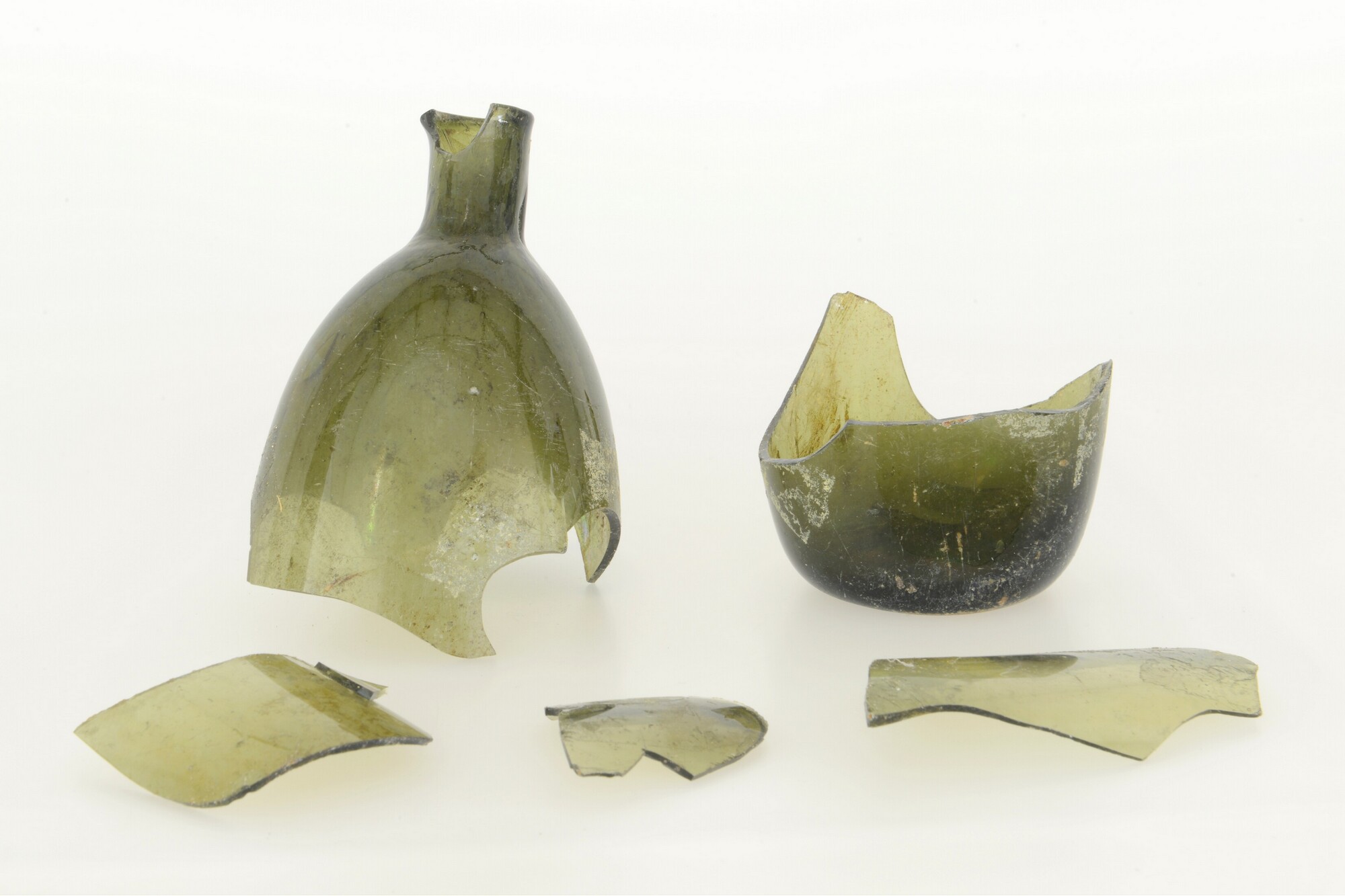 Fles; gl-fle-; glas; groen; hol standvlak, weggeslepen P-merk; vormgeblazen
