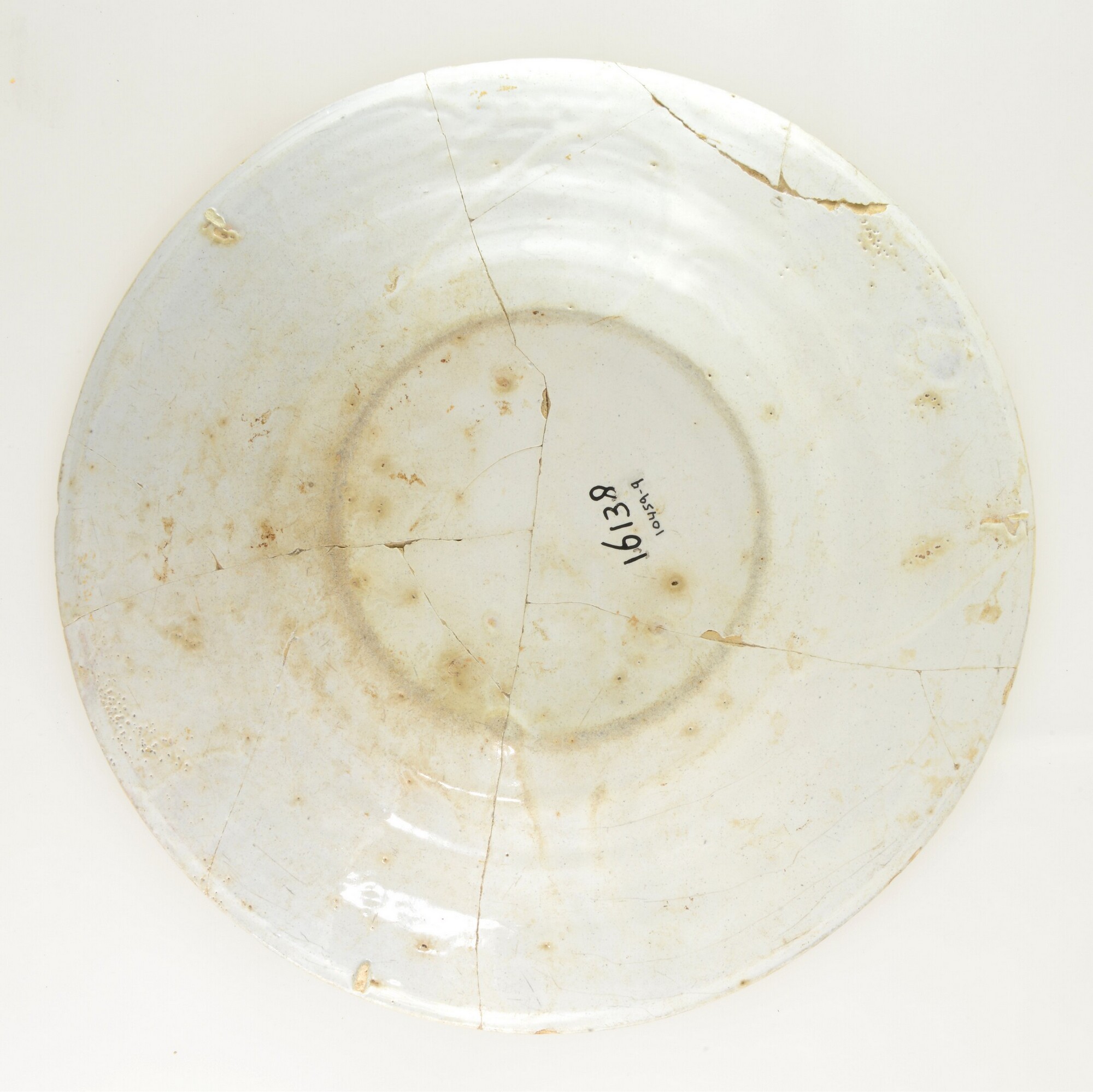 Bord; f-bor-19; plat bord met platte spiegel, zeer brede vlag inwendig met knik afgezet; faience; tinglazuur; geheel wit; standvlak; herkomst: Nederland