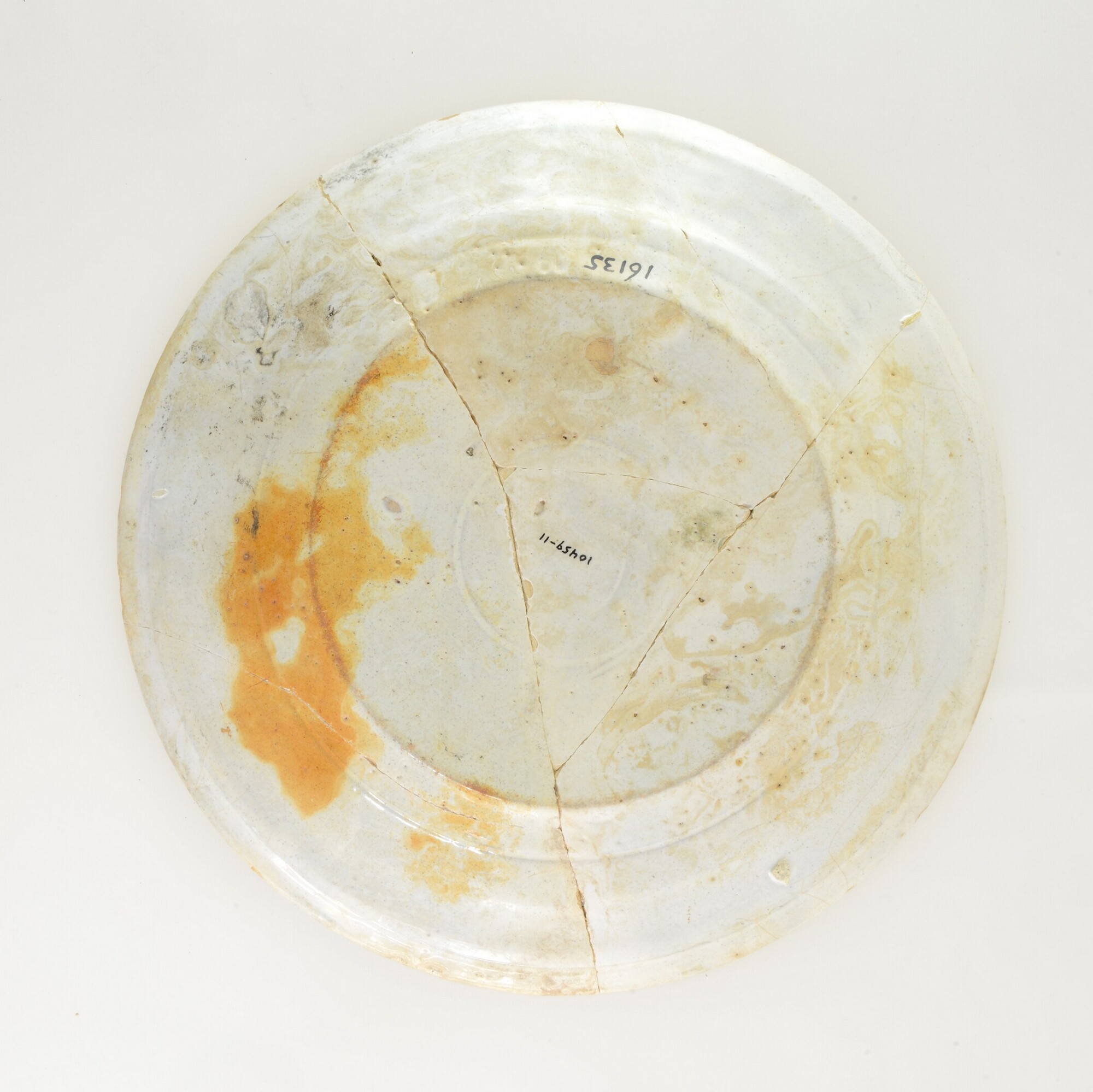 Bord; f-bor-2; plat bord met platte spiegel, platte vlag inwendig met knik afgezet; Nederlandse faience; tinglazuur; geheel wit; standvlak