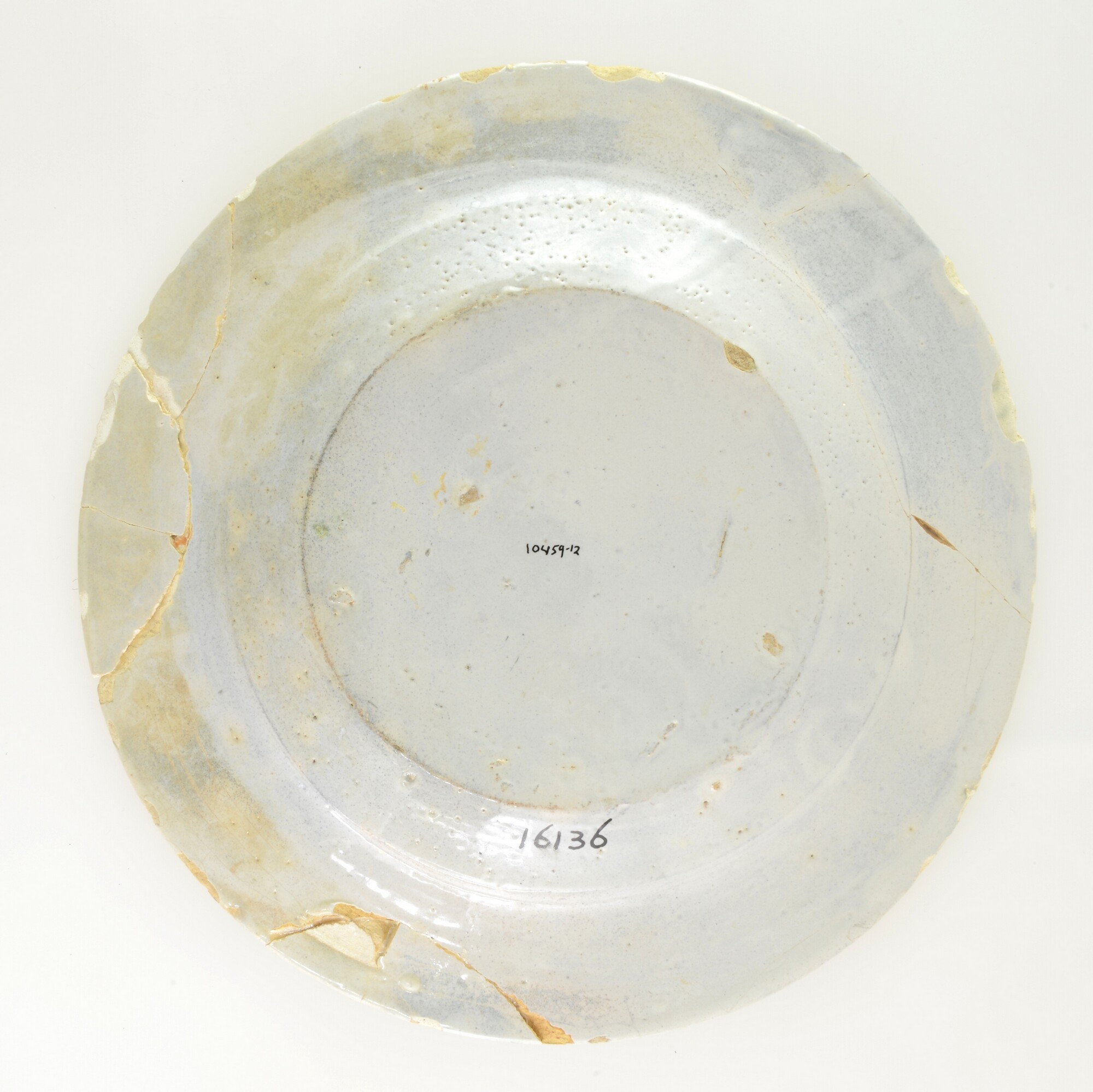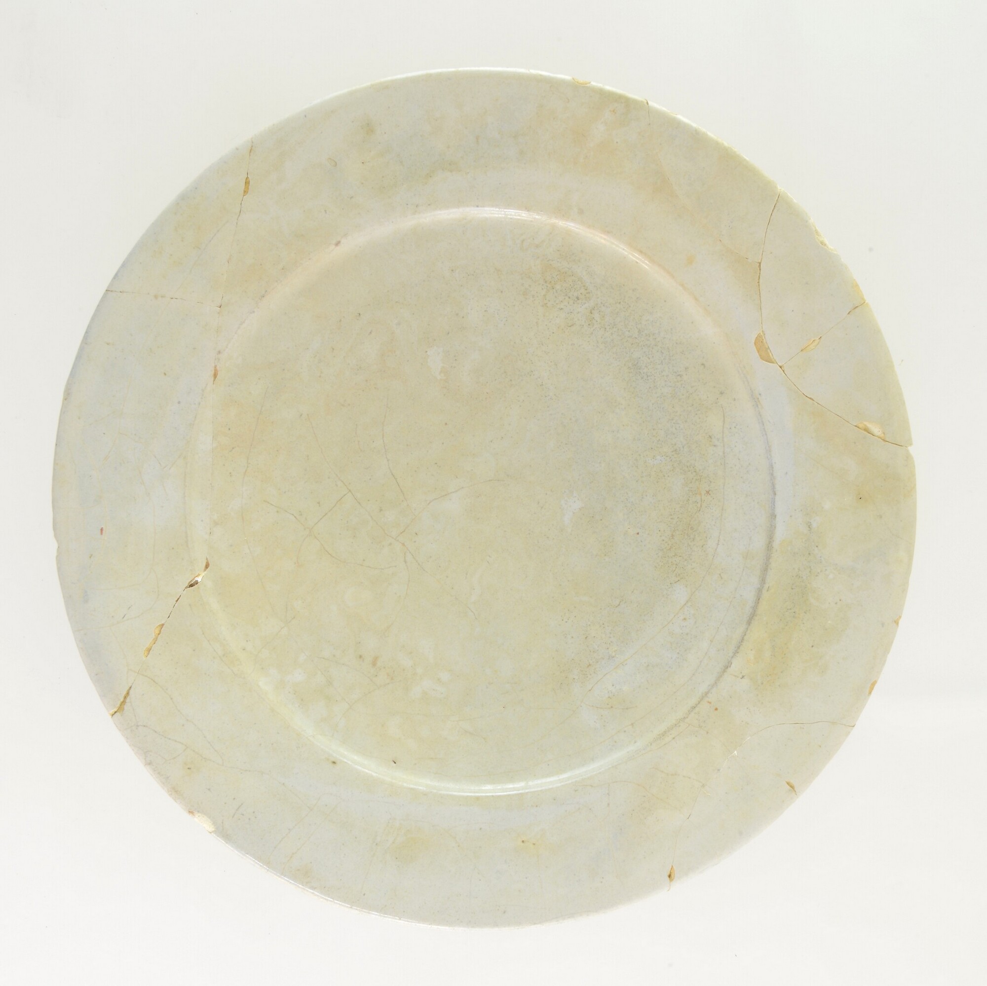 Bord; f-bor-2; plat bord met platte spiegel, platte vlag inwendig met knik afgezet; Nederlandse faience; tinglazuur; geheel wit; standvlak
