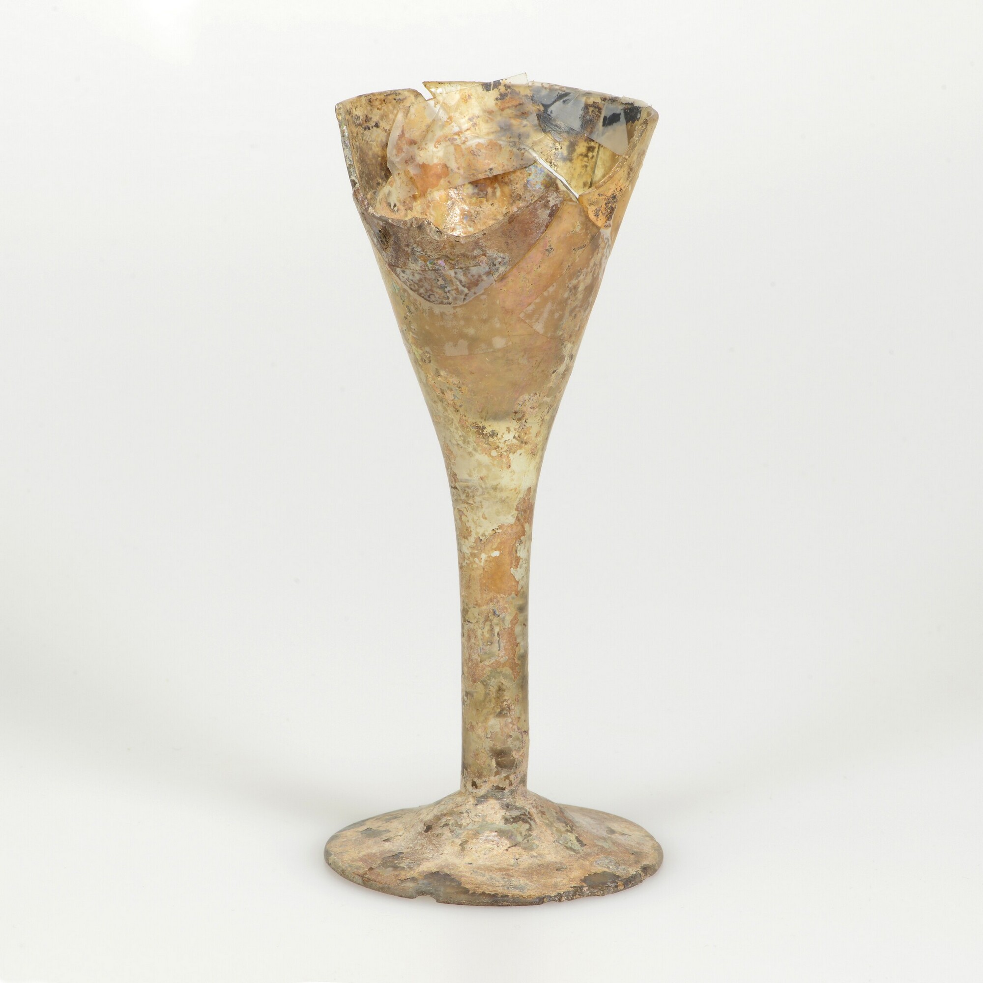 Kelkglas; gl-kel-2; kleurloos glas met druppel in de stam, de kelk loopt door in de stam; herkomst: Nederland of Engeland