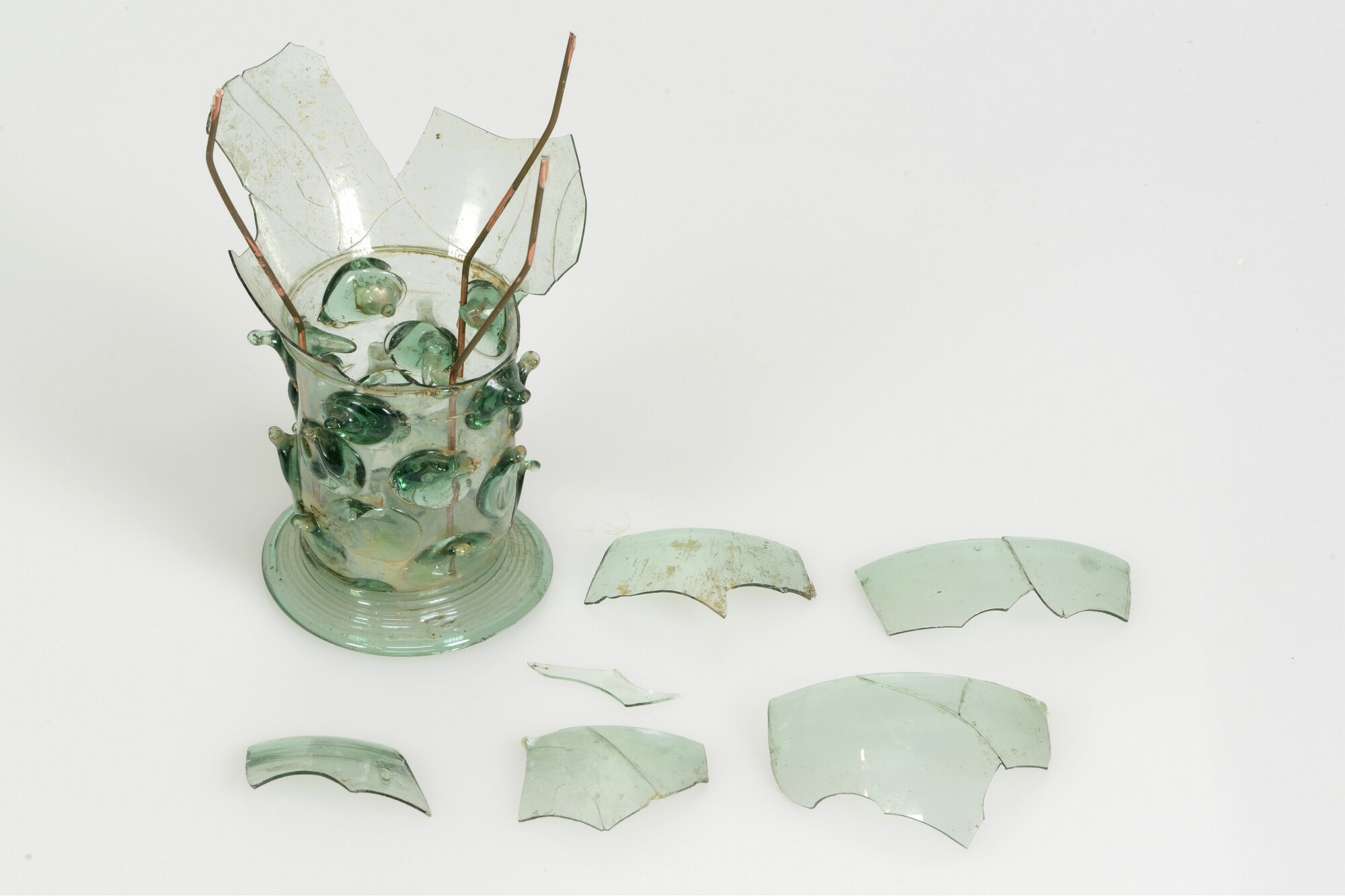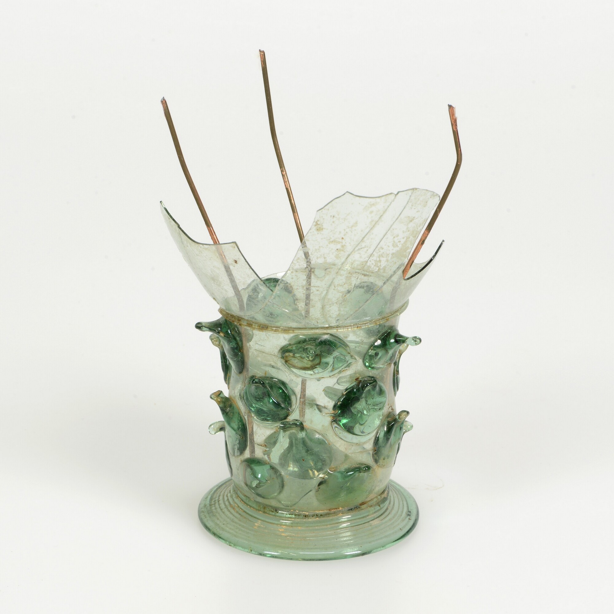 Roemer; gl-roe-6b?; roemer met eivormige kelk; 4 rijen met gedoornde noppen; gewonden draadvoet