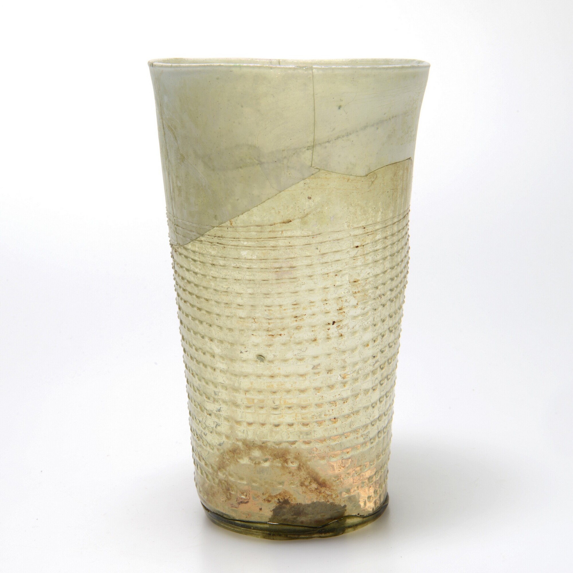 Beker / wafelbeker; gl-bek-19b; licht conische beker met wafelpatroon, rechte rand, opgestoken bodem met pontilmerk, gladde voetring; herkomst: Duitsland of Nederland