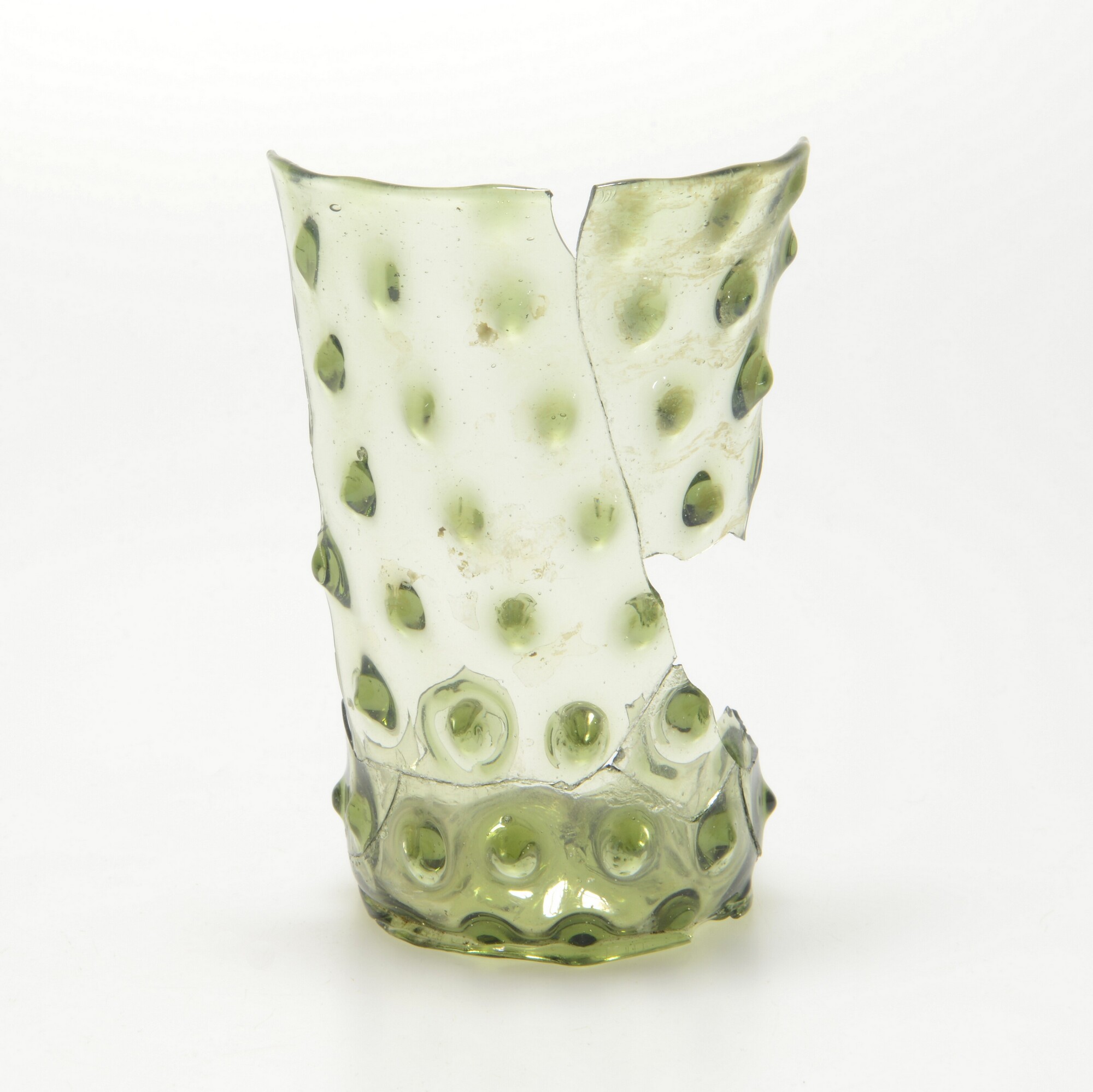 Knobbelbeker; gl-bek-12b; groen glas; opgestoken bodem met pontilmerk en geribde voetring; vormgeblazen; 'tranen'-patroon; rechte rand
