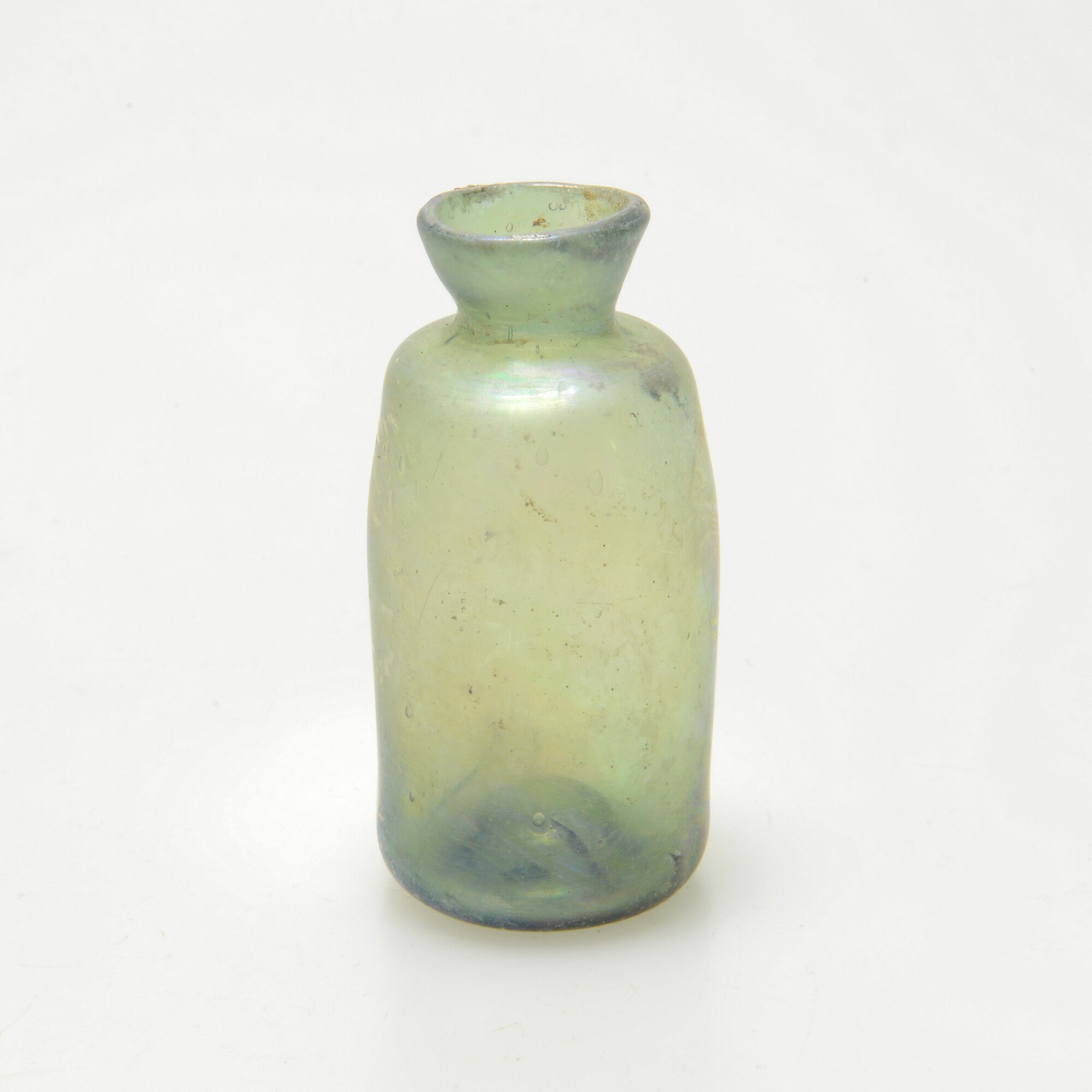 Medicijnfles; gl-fle-11; groen glas; cilindrische fles met korte hals en uitgebogen rand; opgestoken bodem met pontilmerk