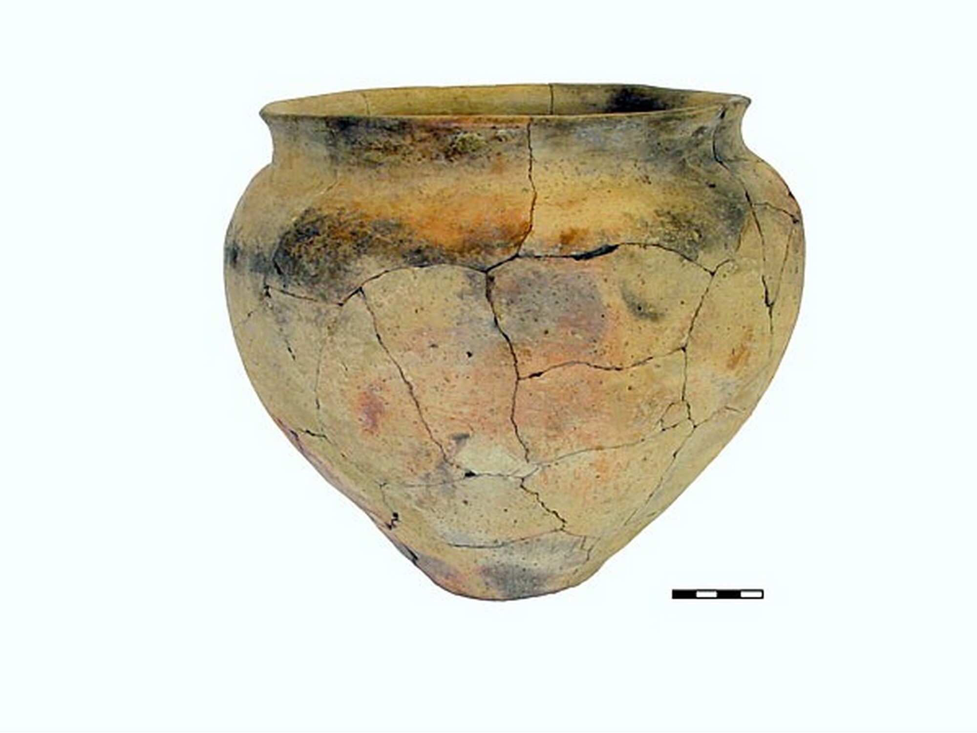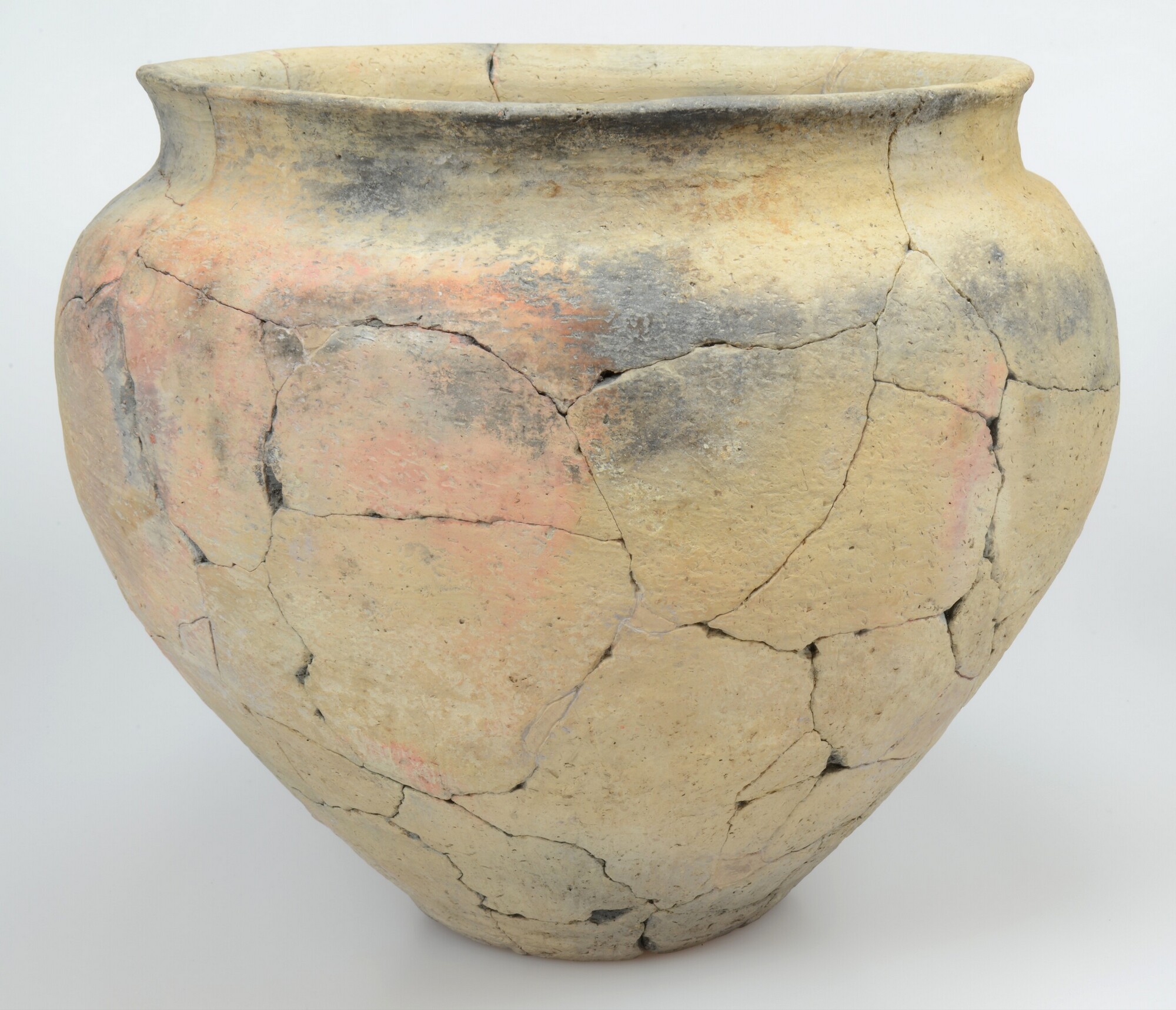 Pot; type Diederik F-IVa; inheems-Romeins aardewerk; handgevormd; wijdmondige pot met hoge schouder/nek en drie vingerindrukken op de hals/schouder; standvlak; potgruismagering